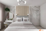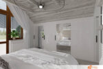 Ložnice působí jemně a elegantně díky kombinaci bílé a šedé, které společně vytvářejí klidnou atmosféru. Vysoká postel uprostřed místnosti poutá pozornost nejen svými rozměry, ale také precizně čalouněným čelem. Podsvícení čela vrhá měkké světlo na stěnu a vytváří příjemné pozadí pro večerní odpočinek.