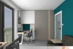 Kancelář zaujme na první pohled výraznou tyrkysovou zdí, která určuje tón celému prostoru. Tato barva vnáší do místnosti svěžest i energii a podporuje soustředění bez rušivého vlivu. Tyrkysový odstín navazuje na moderní pojetí vybavení, které se opírá o čisté linie, funkčnost a nadčasový vzhled.