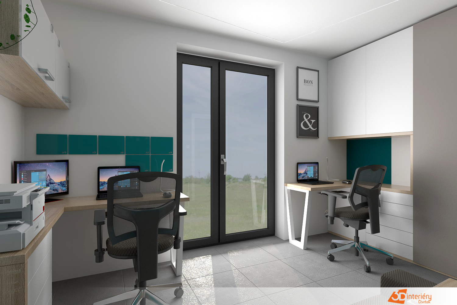 Úložné prostory zůstávají skryté nebo nenápadně zabudované, aby nerušily čistotu designu. Celek působí svěže, profesionálně a motivuje k výkonu i kreativitě.