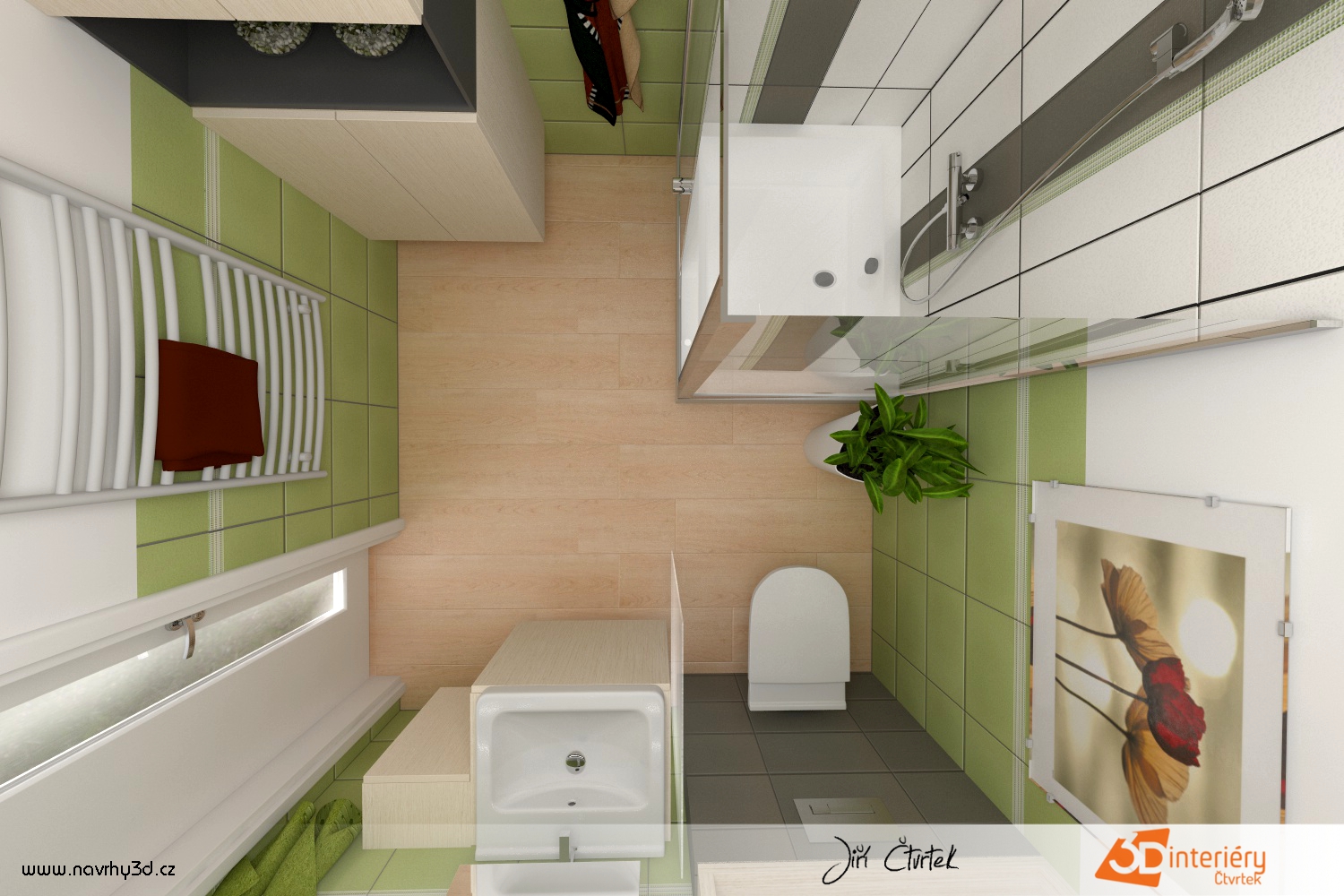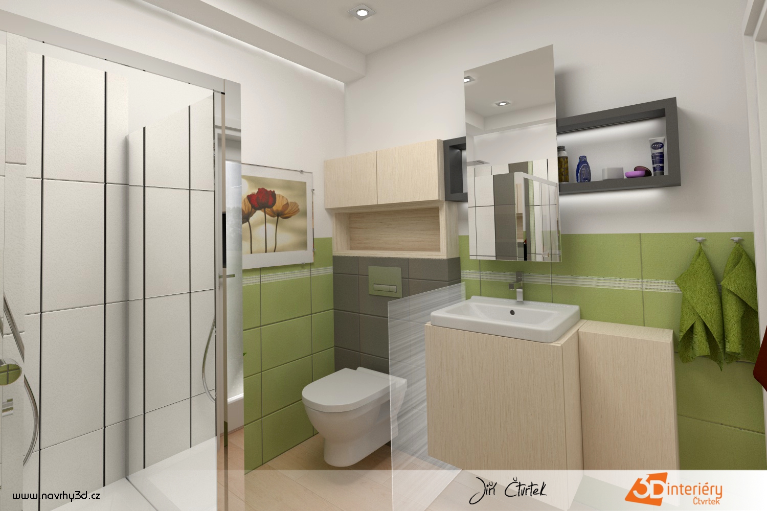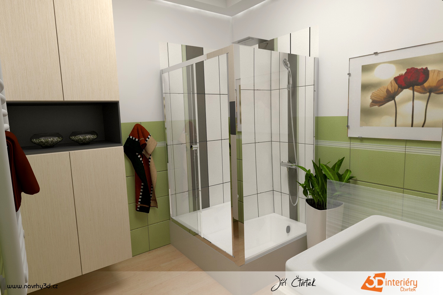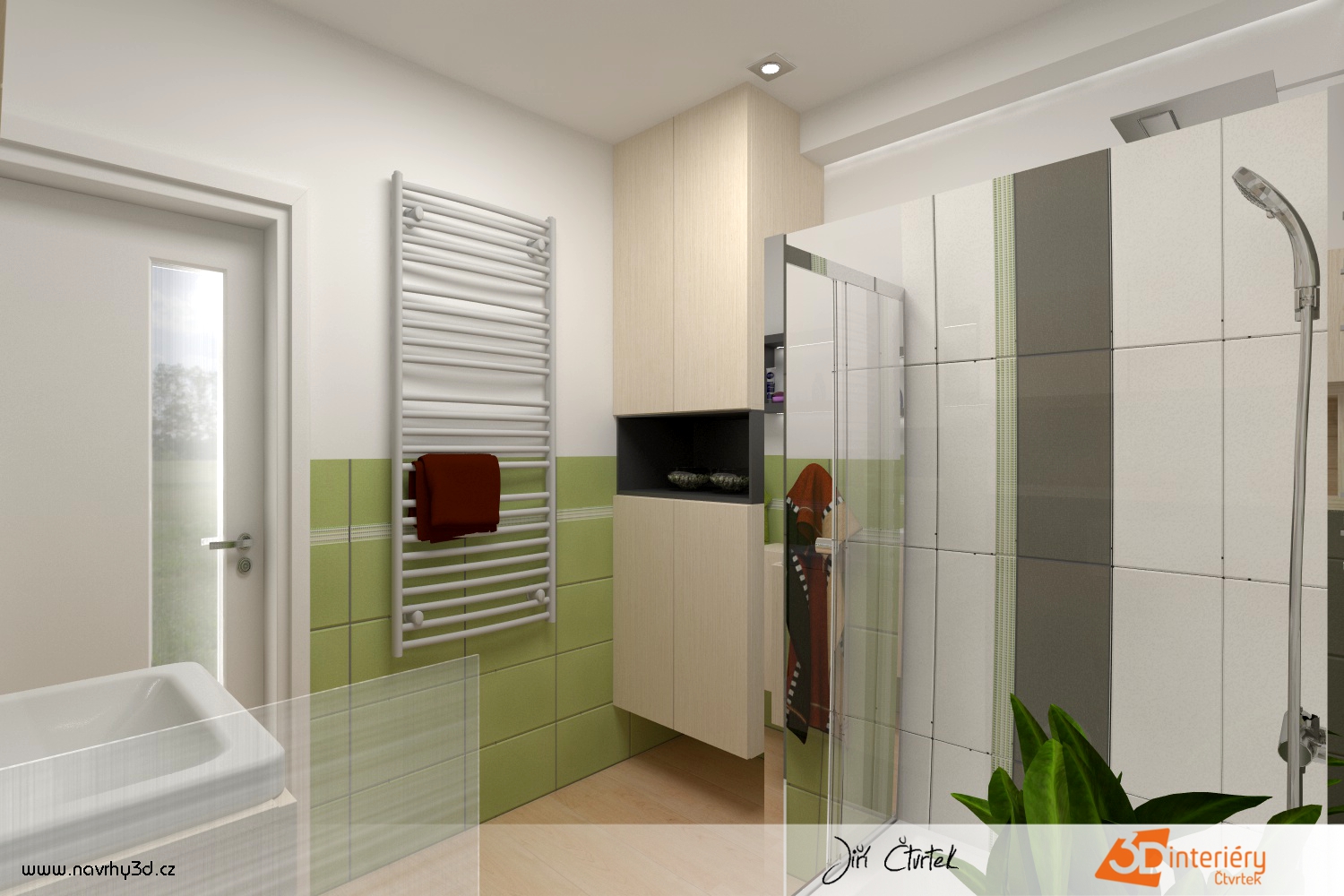 V této koupelně vládne jednoduchost i svěžest. Zdi zdobí zelené kachličky sahající do poloviny výšky, které vytvářejí dojem klidu a čistoty. Zbytek stěn zůstává hladký a bílý, což prostor opticky zvětšuje a prosvětluje. V rohu se nachází prostorný sprchový kout s čirým sklem a kovovými doplňky, které ladí s celkovým designem místnosti. Voda proudí silně a rovnoměrně, takže ranní sprcha nabíjí energií na celý den.