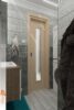 Sprchový kout s čirým sklem přispívá k celkové vzdušnosti místnosti. Díky průhlednému provedení nepůsobí prostor přeplněně a zachovává vizuální čistotu. V kontrastu s chladnou šedí a minimalistickým designem sprchového koutu zde vynikají detaily ze světlého dřeva – například deska pod umyvadlem, otevřené police nebo rám zrcadla. Tyto přírodní prvky zjemňují celkový dojem a vnášejí do prostoru teplo i strukturu.
