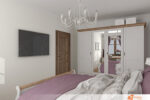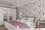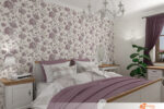 Celý interiér ladí do tónů fialové a bílé. Tyto barvy spolu vytvářejí harmonii, která působí klidně i vznešeně. Stěny nese tapeta s jemným fialovobílým vzorem – květy, ornamenty nebo geometrické linie se prolínají v rytmu, který nezatěžuje, ale zaujme.