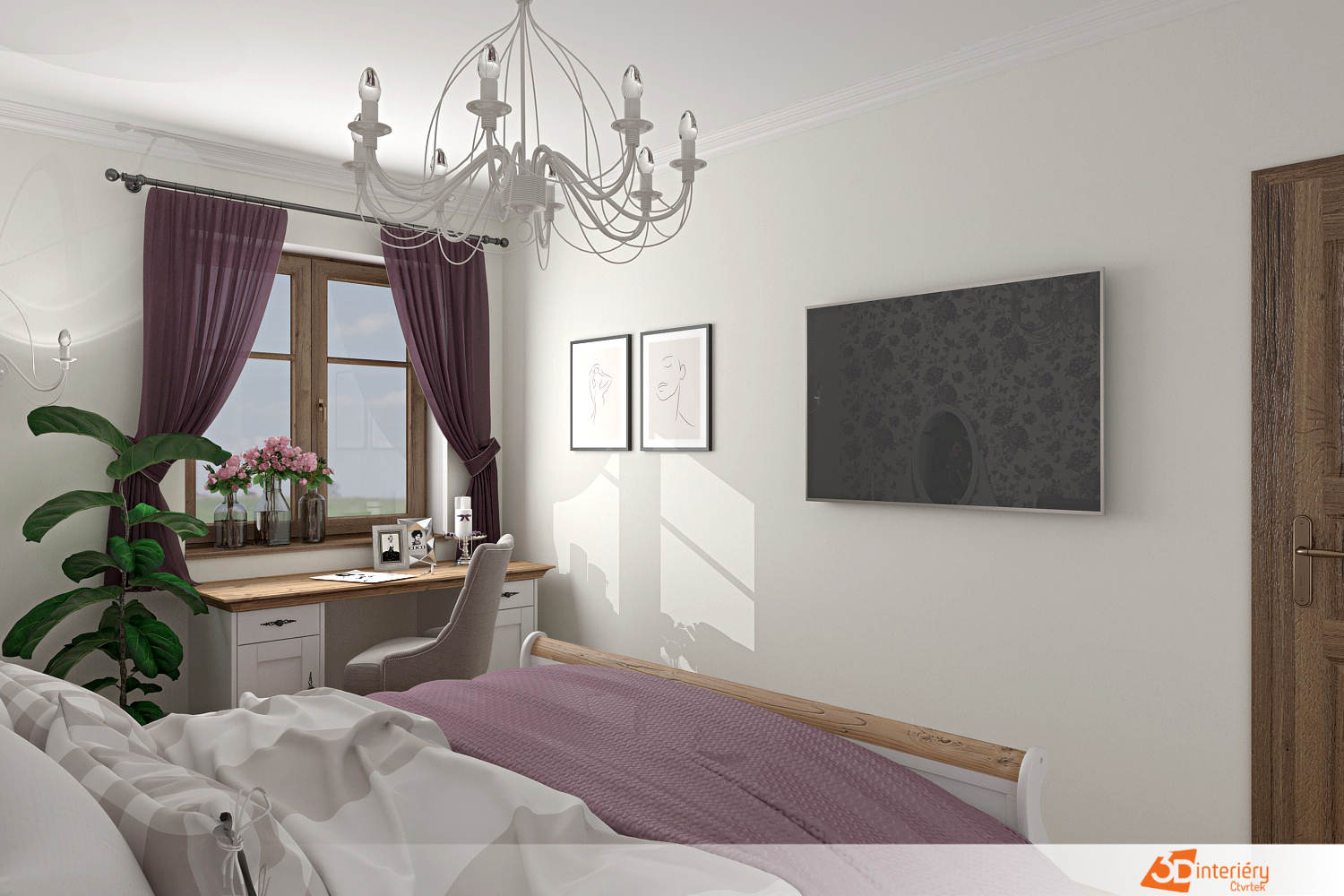 Závěsy v sytě fialovém odstínu sahají až k podlaze a zjemňují světlo proudící z oken. Jejich látka splývá hladce, navazuje na barvu drobných polštářků nebo přehozu na posteli. Nábytek nese prvky bílé s jemnými dekoracemi – noční stolky, komoda, dokonce i rámy obrazů.