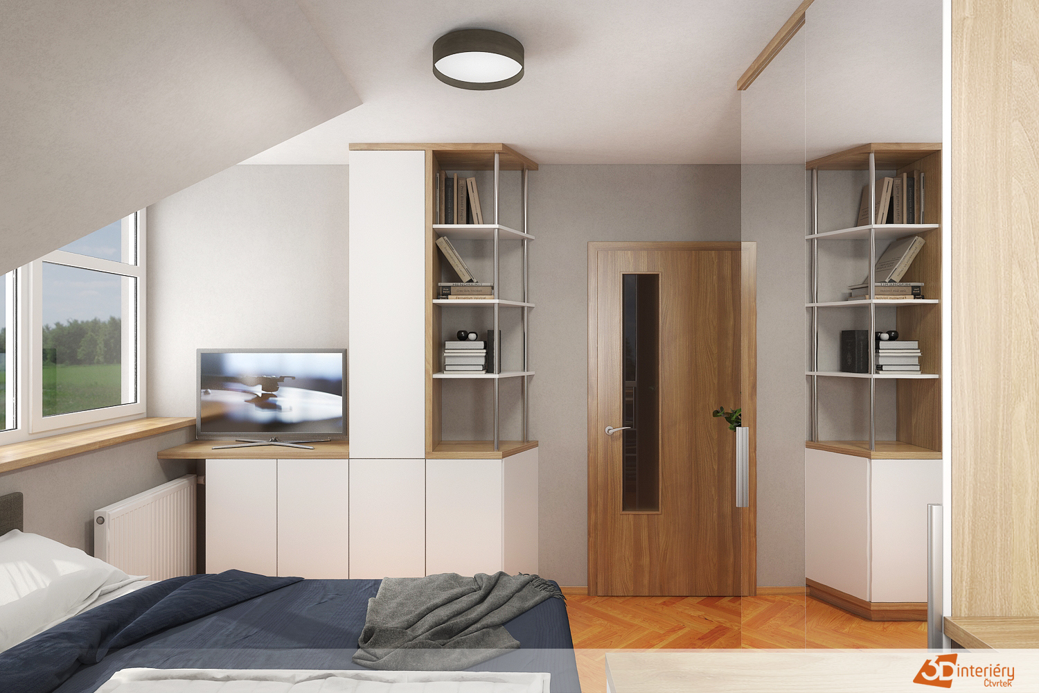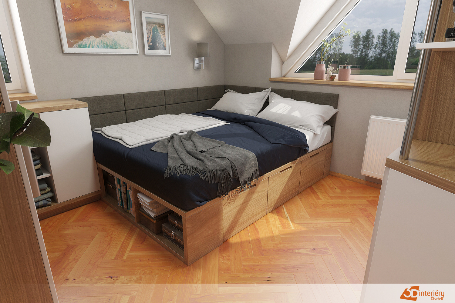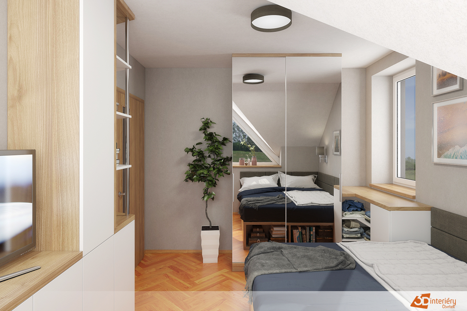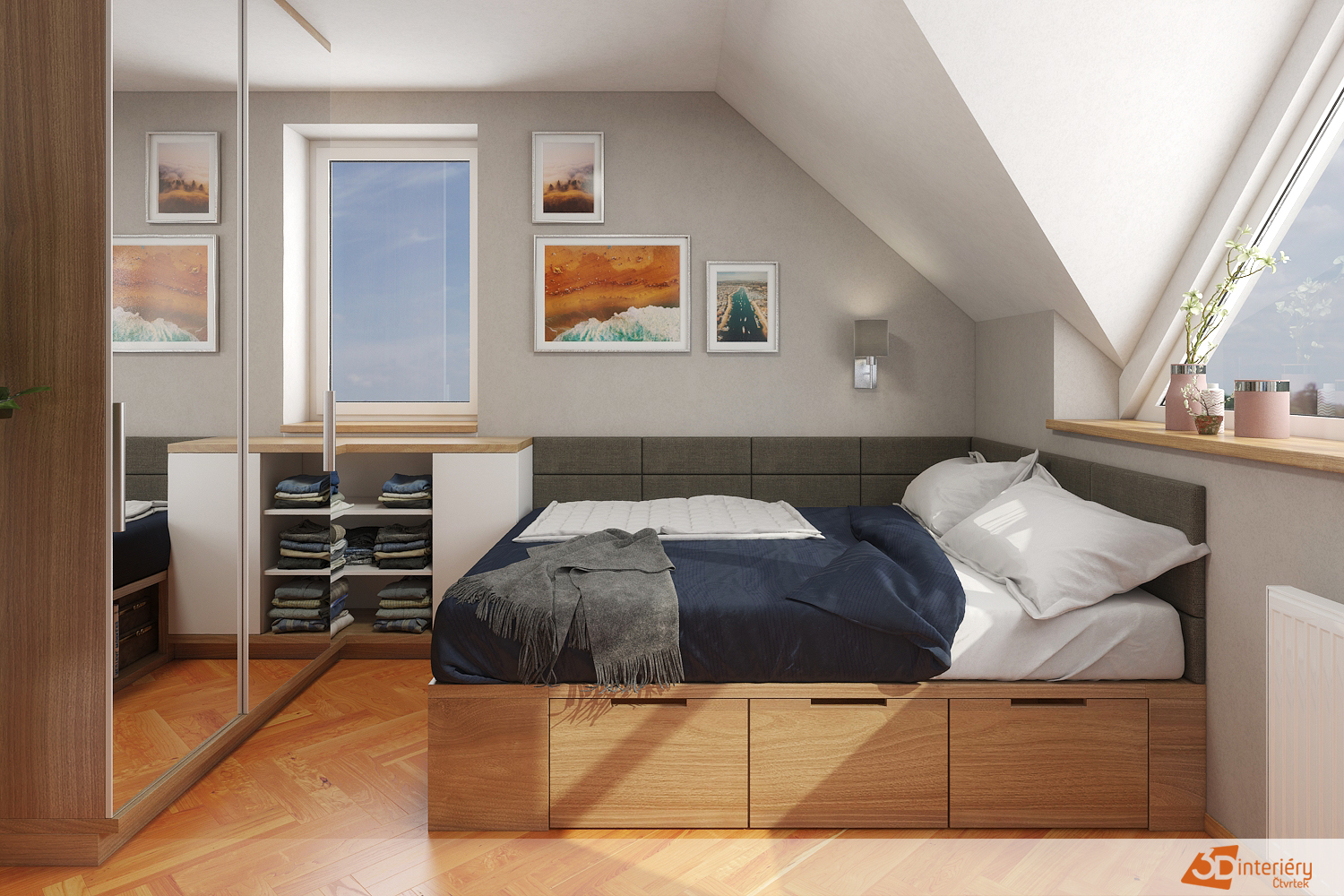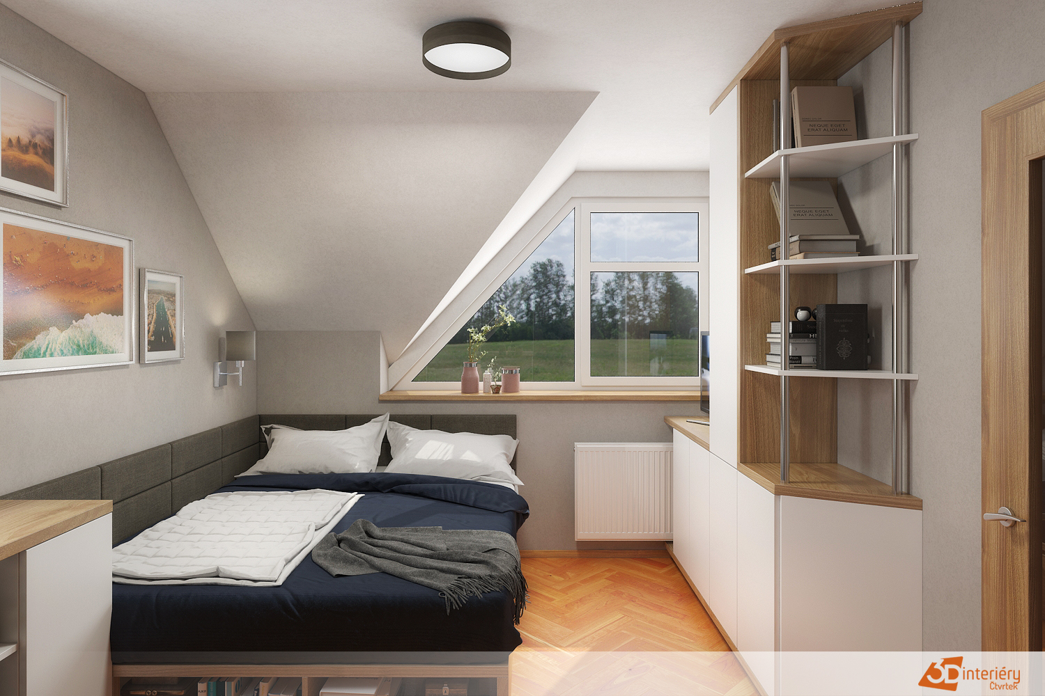 Pokoj pro studenta by měla být místem klidu, soustředění i pohodlného odpočinku. V tomto pokoji hraje hlavní roli kvalitní postel s pevnou konstrukcí a ergonomickou matrací, která zajišťuje zdravý spánek po dlouhém dni plném studia. Postel je umístěna pod šikmou stěnou, která dodává prostoru charakter a útulnost. Bílé stěny celou místnost opticky zvětšují a odrážejí přirozené světlo, což vytváří svěží a vzdušnou atmosféru.