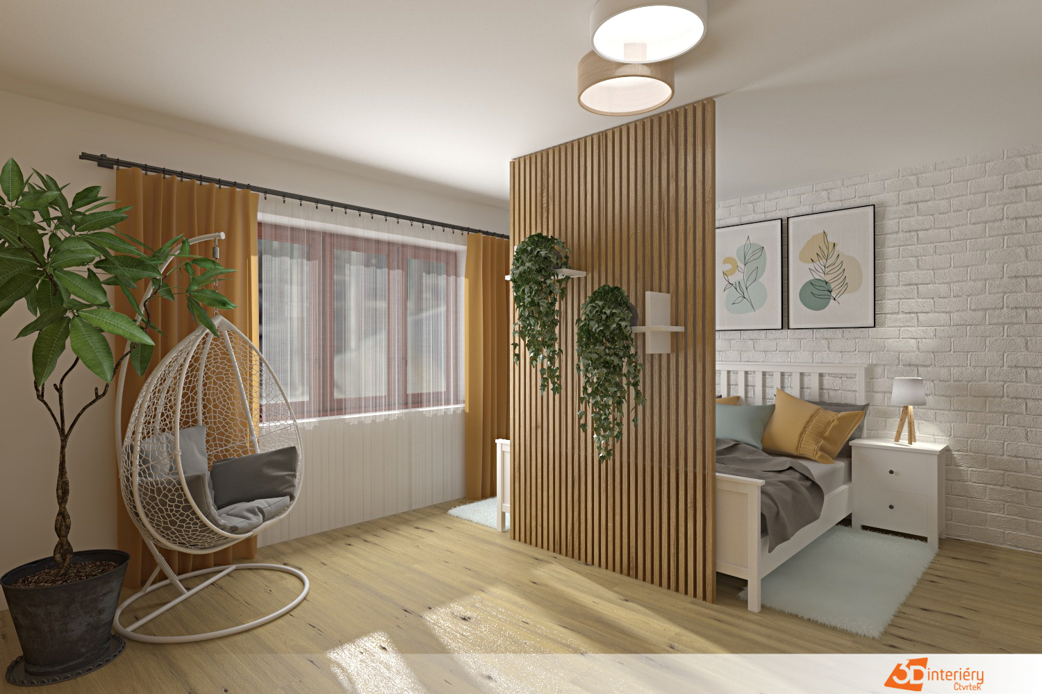 Ze stropu se vznáší zavěšené křesílko ve tvaru vajíčka, které vybízí k odpočinku nebo čtení. Jeho oblý tvar kontrastuje s přímými liniemi nábytku a vnáší do prostoru hravost. Křesílko se mírně pohupuje a vytváří uklidňující pohyb, ideální pro chvíle klidu.