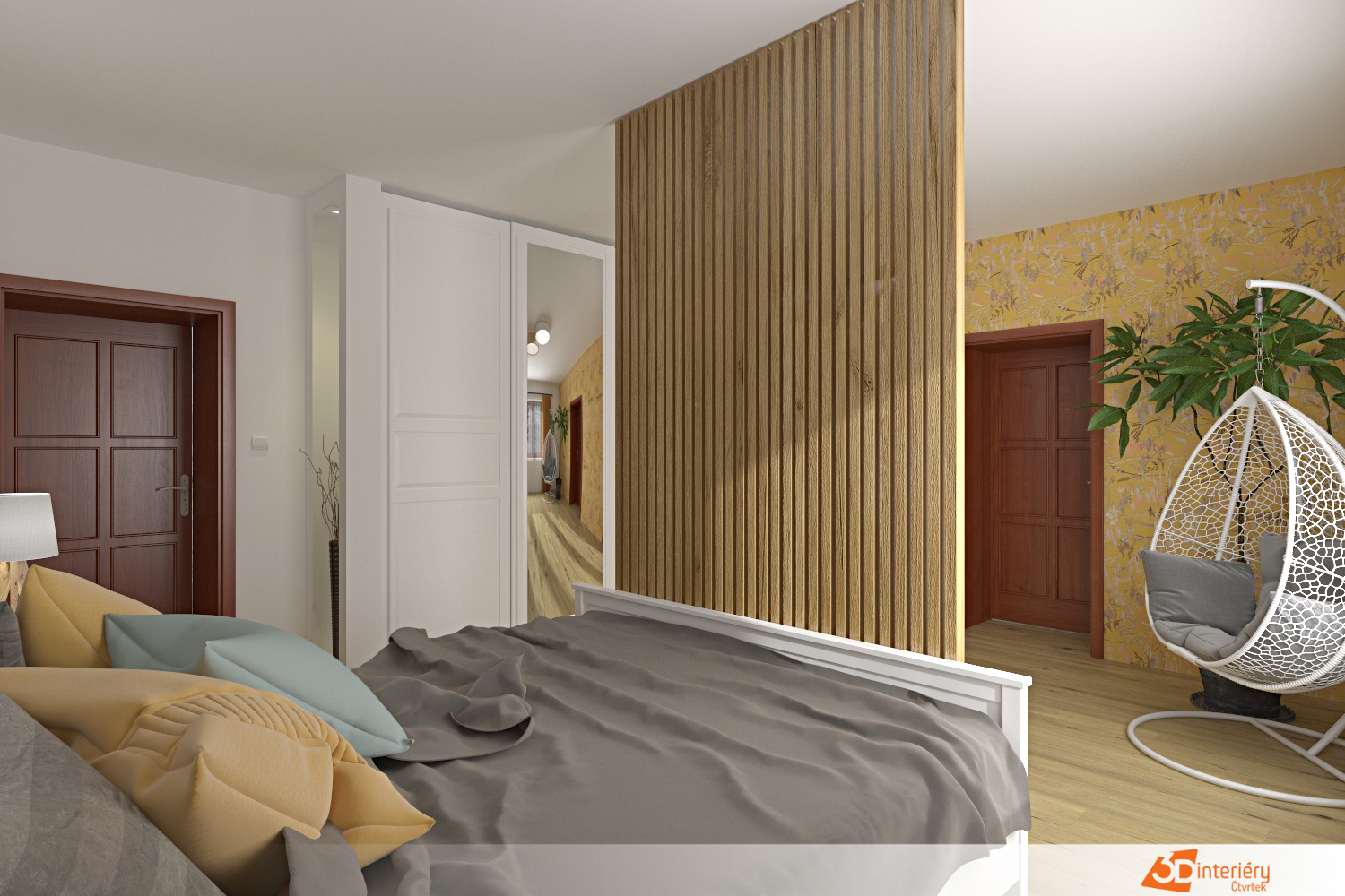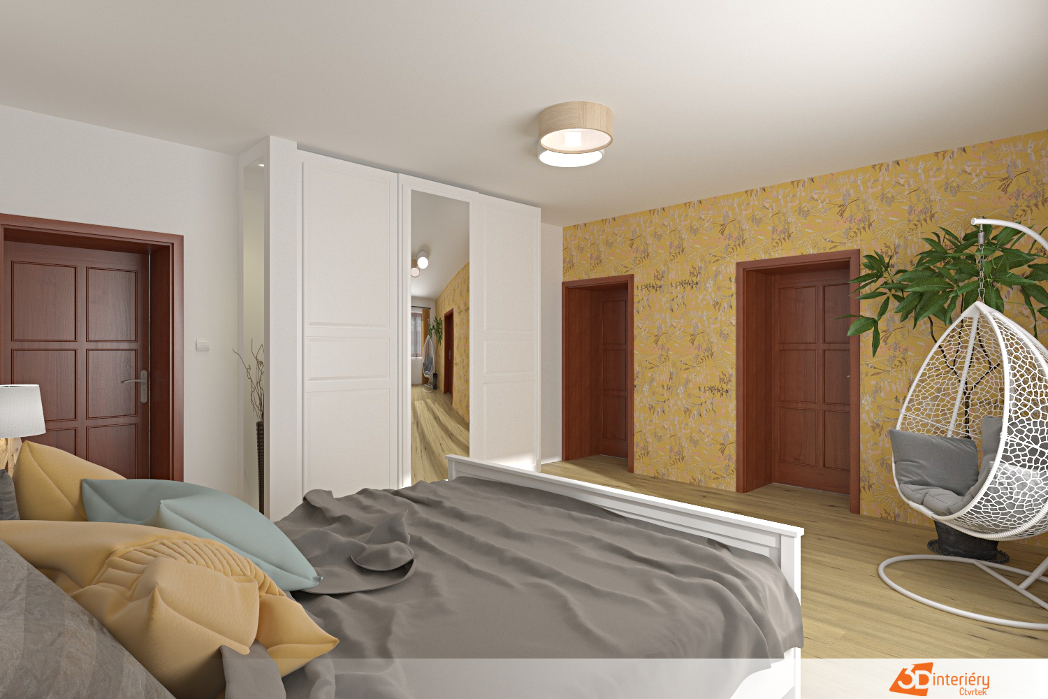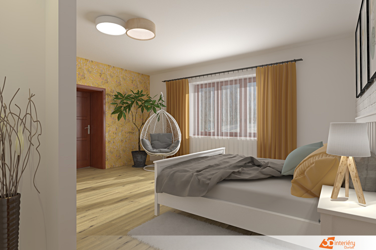 Podlaha zaujme světlým odstínem dřeva, který odráží světlo a podporuje pocit vzdušnosti. Mezi stěnami se nachází jedna s výraznou žlutou tapetou, která oživuje celkovou barevnost a dodává místnosti energii. Žlutý vzor nepůsobí rušivě, naopak vnáší do prostoru radost a teplo.