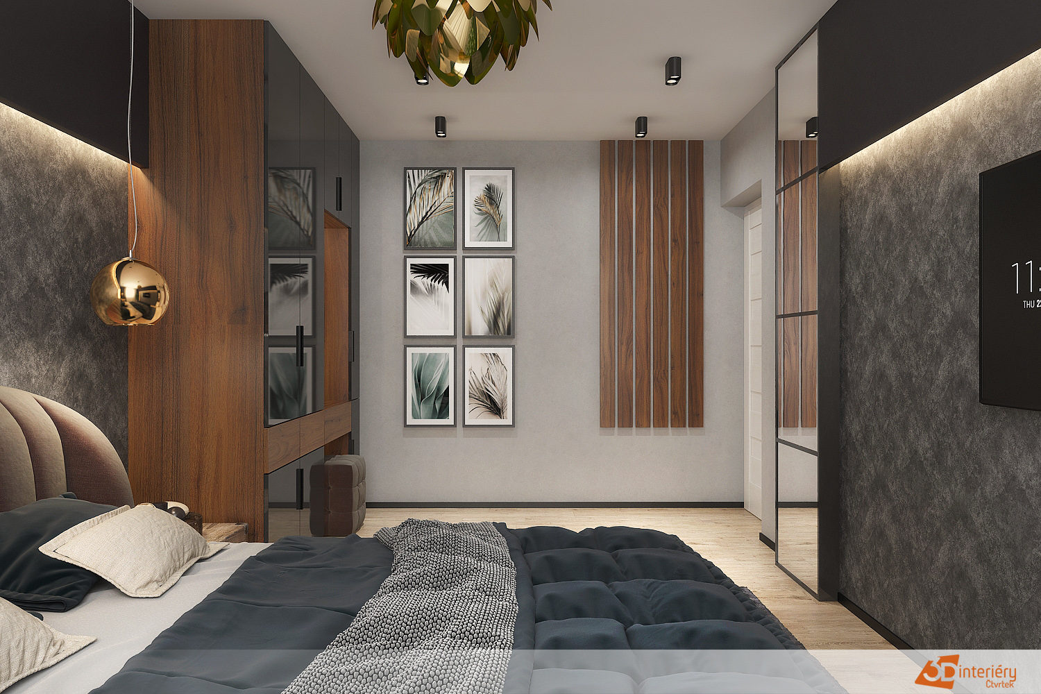 Objevte výraznější dekor dřeva kombinovaný tmavě šedými lesklými dvířky s černými kovovými úchytkami. SDK přizdívka je zabarvena na tmavě šedou, skoro až černou barvu a ohraničuje plochu, na které je natažená tapeta s šedou betonovou patinou. Nakonec se nad postel umístili tři závěsné lampy s lesklým měděným povrchem, který celkovému vzhledu pokoje dodá trochu „šťávy“.