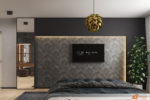 Ložnice v Brně – tím jak byl pokoj dlouhý bylo od začátku jasné, že postel nebude umístěná uprostřed zdi. Napravo od postele bude velká šatní skříň, čímž následně bude pokoj působit dost asymetrickým dojmem (stejně jako stávající ložnice). Proto jsem se rozhodl tuto asymetrii ještě více posilnit pomocí prvků jako je: SDK přizdívka za postelí a kolem televize, záclona s jedním závěsem a koberec částečně zasunutý pod postel. Třešničkou na tomto asymetrickém dortu jsou truhla a drátěný stolek namísto nočních stoků (ty se klidně můžou kdykoliv zaměnit za klasické noční stolky)..