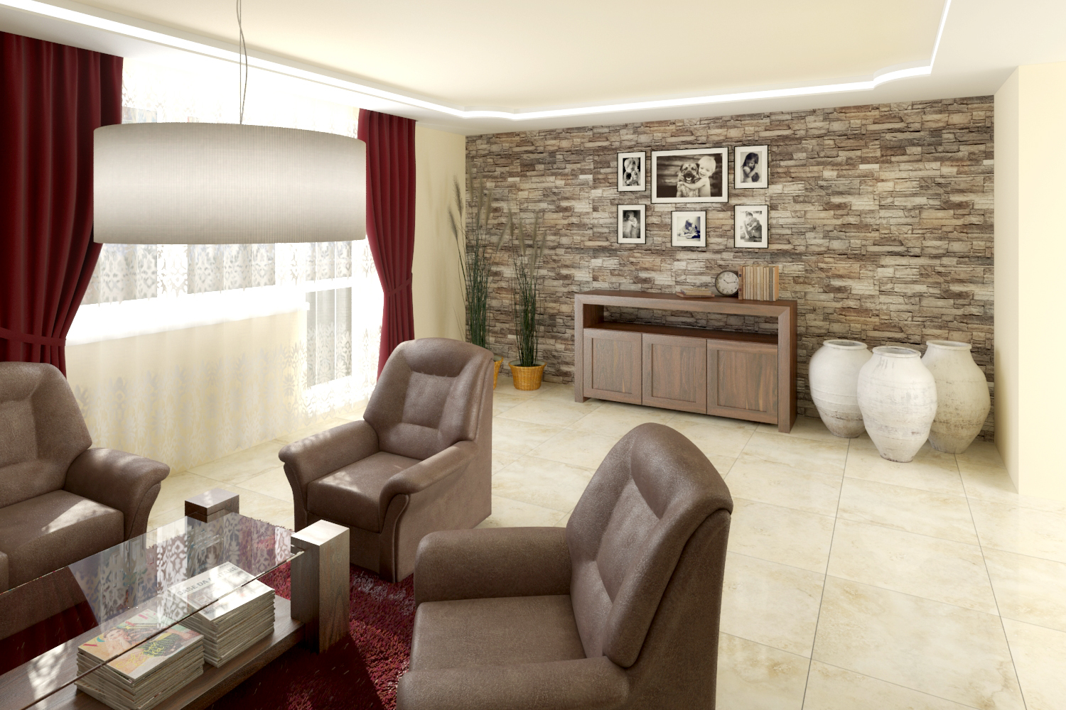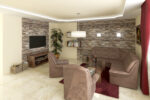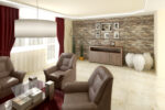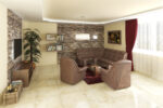 Prostor nabízí luxusní atmosféru díky elegantní mramorové podlaze, která dodává prostoru sofistikovaný vzhled a zároveň působí chladivě a svěže. Hnědá křesla vytvářejí útulný kout pro posezení, jejich teplý odstín kontrastuje s chladivým leskem podlahy. Kobereček pod křesly dokonale ladí s červenými závěsy, což přináší do místnosti výrazný barevný akcent a pocit tepla.