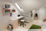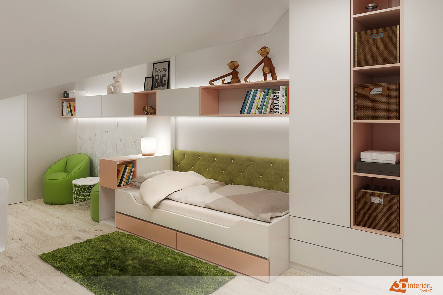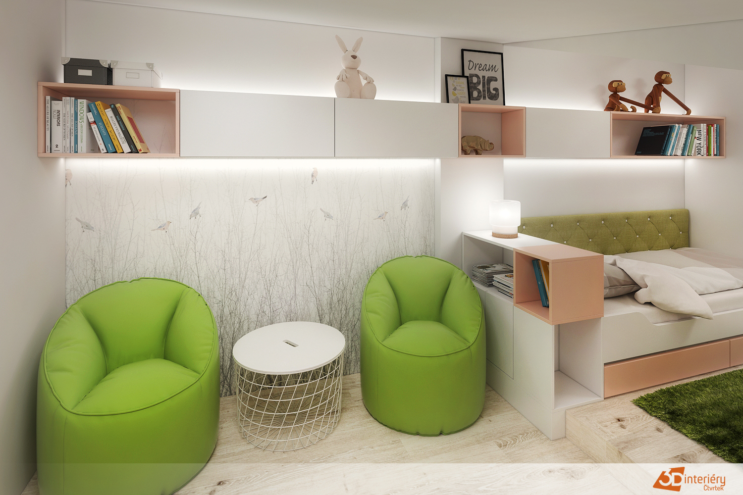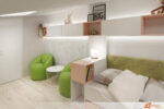 Vedle křesel se rozprostírá pohodlná postel se světle zeleným čelem, které působí jemně a svěže. Pod postelí se nachází menší kobereček s povrchem připomínajícím skutečný mech. Každý dotek nohou vyvolává pocit, jako by se člověk procházel lesem. Tento detail přináší do místnosti přírodní rovnováhu i prvek překvapení.