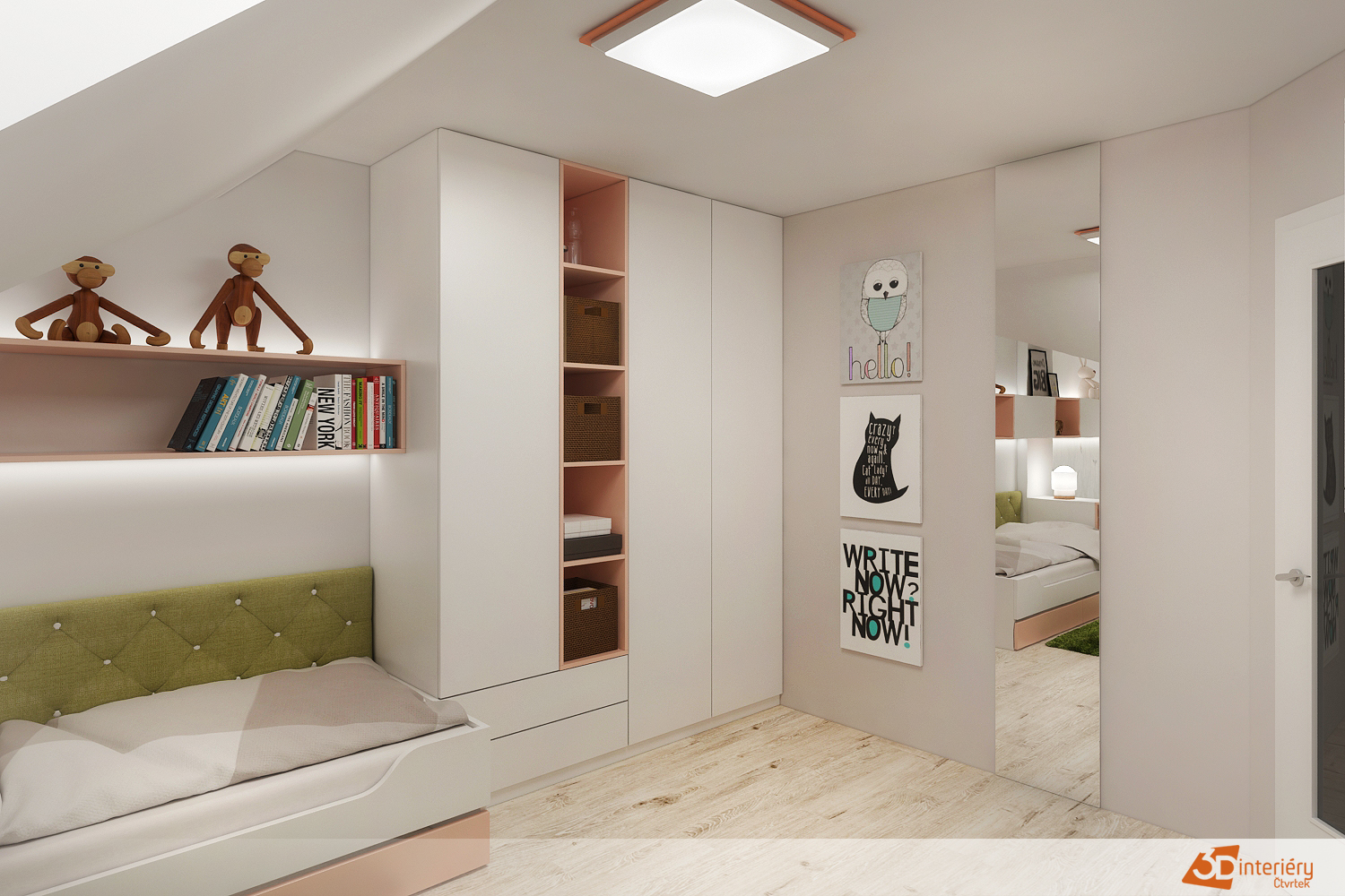 Stěny pokoj odívá do čisté bílé, což poskytuje ideální pozadí pro další prvky. Na jedné z nich visí úzké podlouhlé zrcadlo s jednoduchým rámem. Zrcadlo nejen opticky zvětšuje prostor, ale zároveň zachycuje světlo a odráží krásu celého interiéru. Tento pokoj nepůsobí okázale, ale každý prvek v něm vyzařuje tichý luxus a důmyslnost.