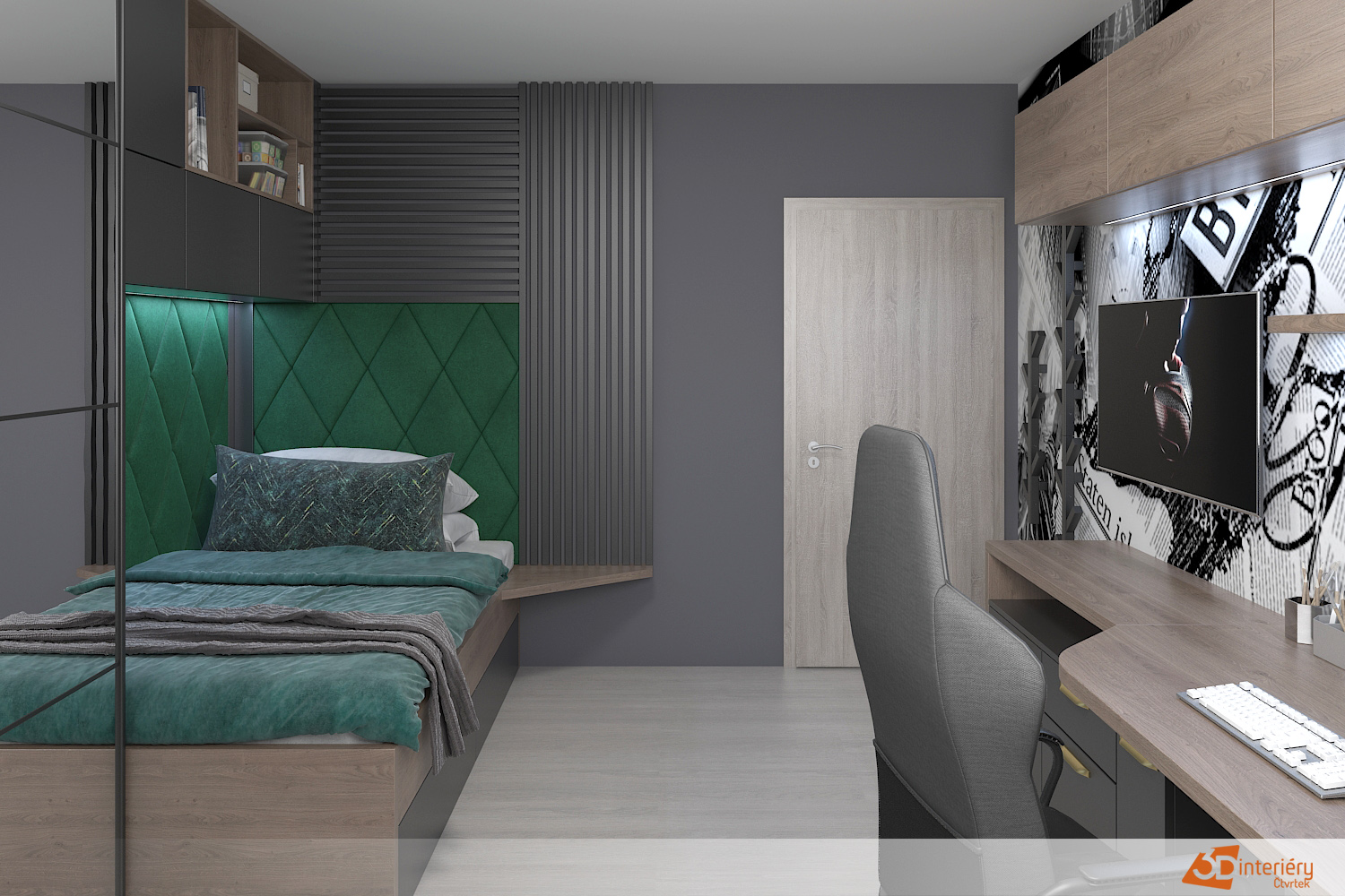 Luxusní pokoj se smaragdovou postelí přináší studentům kombinaci stylu, pohodlí a funkčnosti. Dominantní čalouněná postel ve výrazném smaragdovém odstínu okamžitě upoutá pozornost a dodává prostoru elegantní nádech. Měkké polstrování spolu s množstvím polštářů vytváří ideální místo pro odpočinek, učení i čtení.