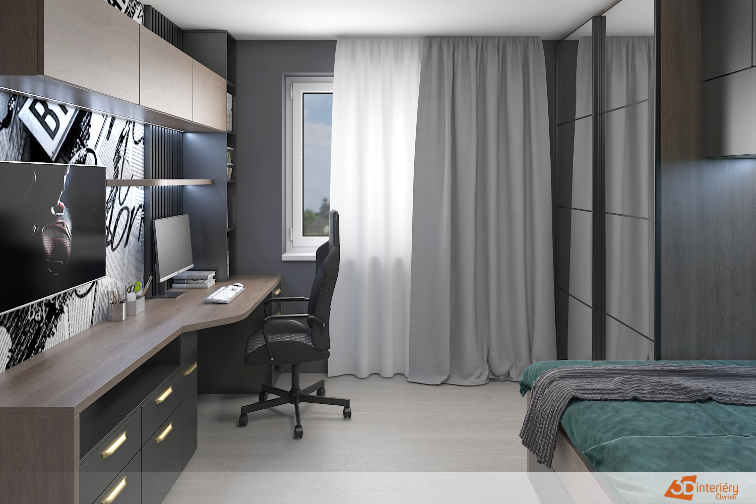 Stěny v neutrálních tónech nechávají vyniknout výrazným prvkům interiéru. U postele stojí noční stolek s kovovou lampou a knihou připravenou na večerní čtení. Pracovní zóna u okna zahrnuje moderní stůl, pohodlnou židli a dostatek úložného prostoru pro učebnice, poznámky i techniku. Nad stolem visí nástěnka s rozvrhem, fotkami a inspirativními citáty.