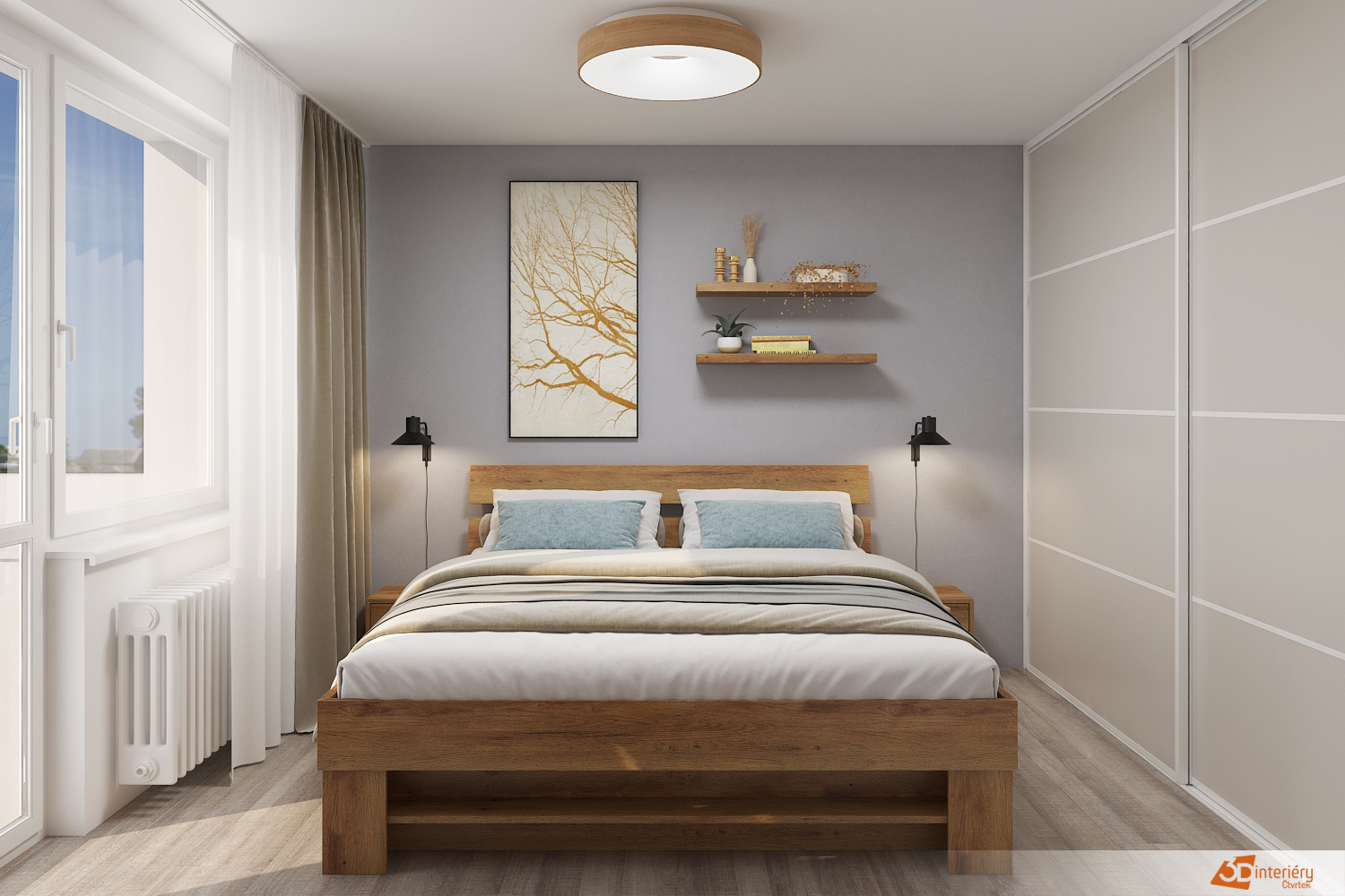 Postel je doplněna moderním osvětlením, které zajišťuje příjemnou atmosféru a zároveň funkčnost. Na obou nočních stolcích stojí černé lampičky, které tvoří elegantní kontrast k světlému interiéru a dodávají ložnici osobitý styl. Celkově prostor působí svěže, prakticky a velmi pohodlně.