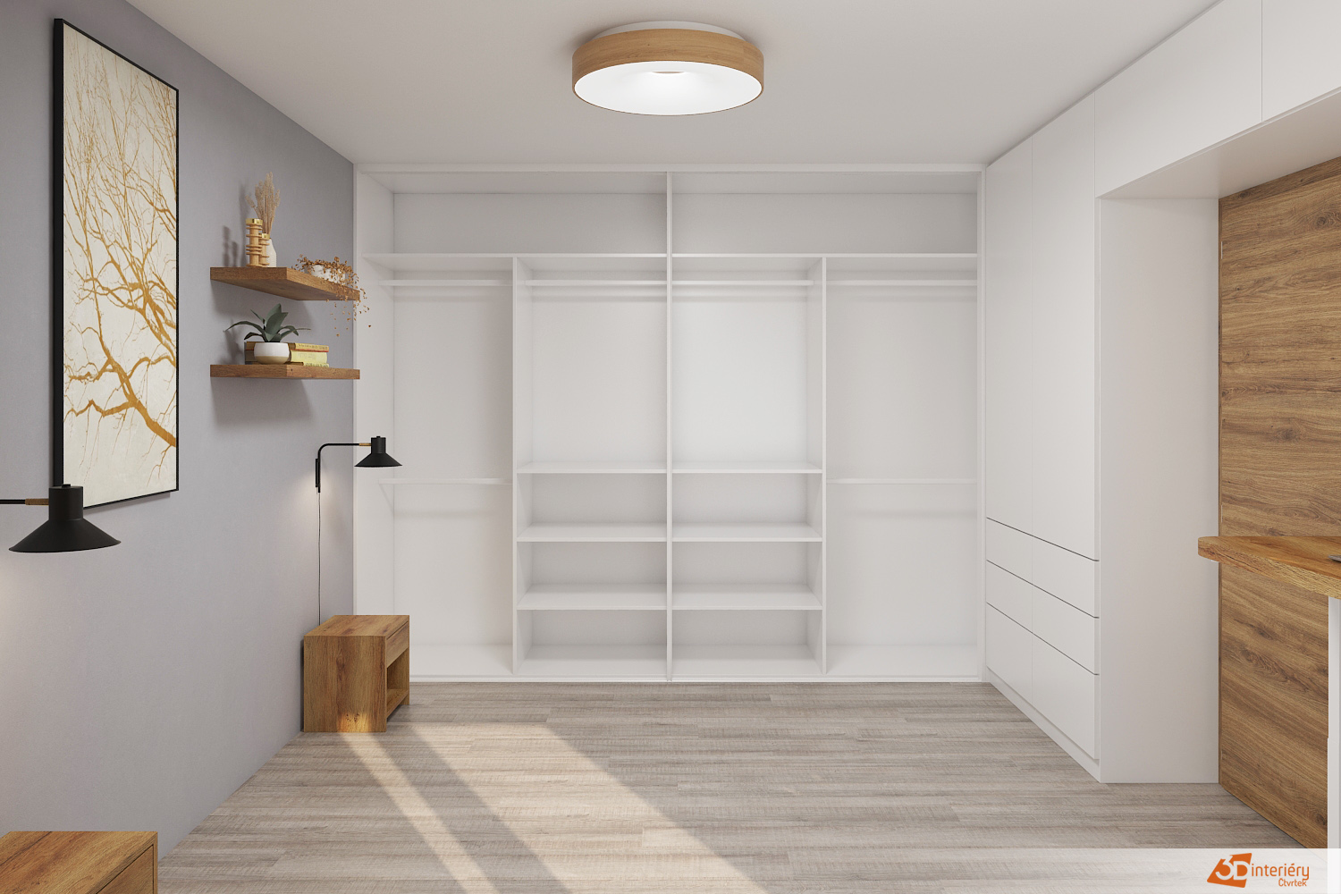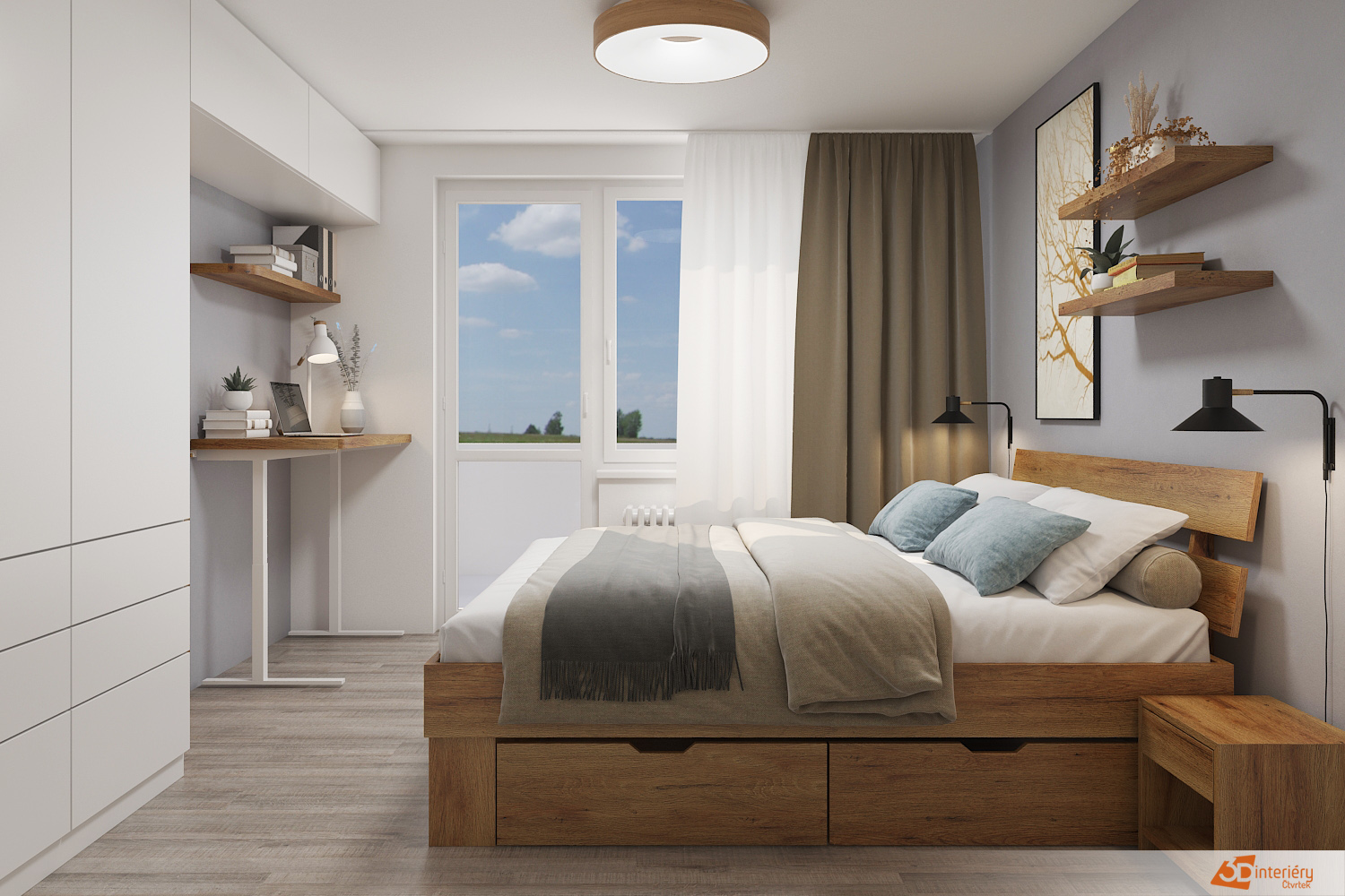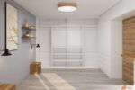 Jedním z hlavních prvků místnosti je velká bílá skříň přes celou stěnu, která nabízí dostatek úložného prostoru. Skříň je vybavena posuvnými dveřmi, což šetří místo a přispívá k čistému a minimalistickému vzhledu pokoje. Vedle dveří je další vestavěná skříň, ladící designem i barvou s tou hlavní, čímž vzniká harmonický celek.