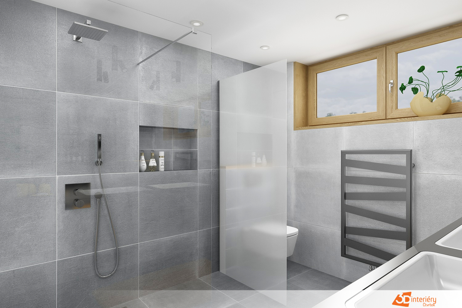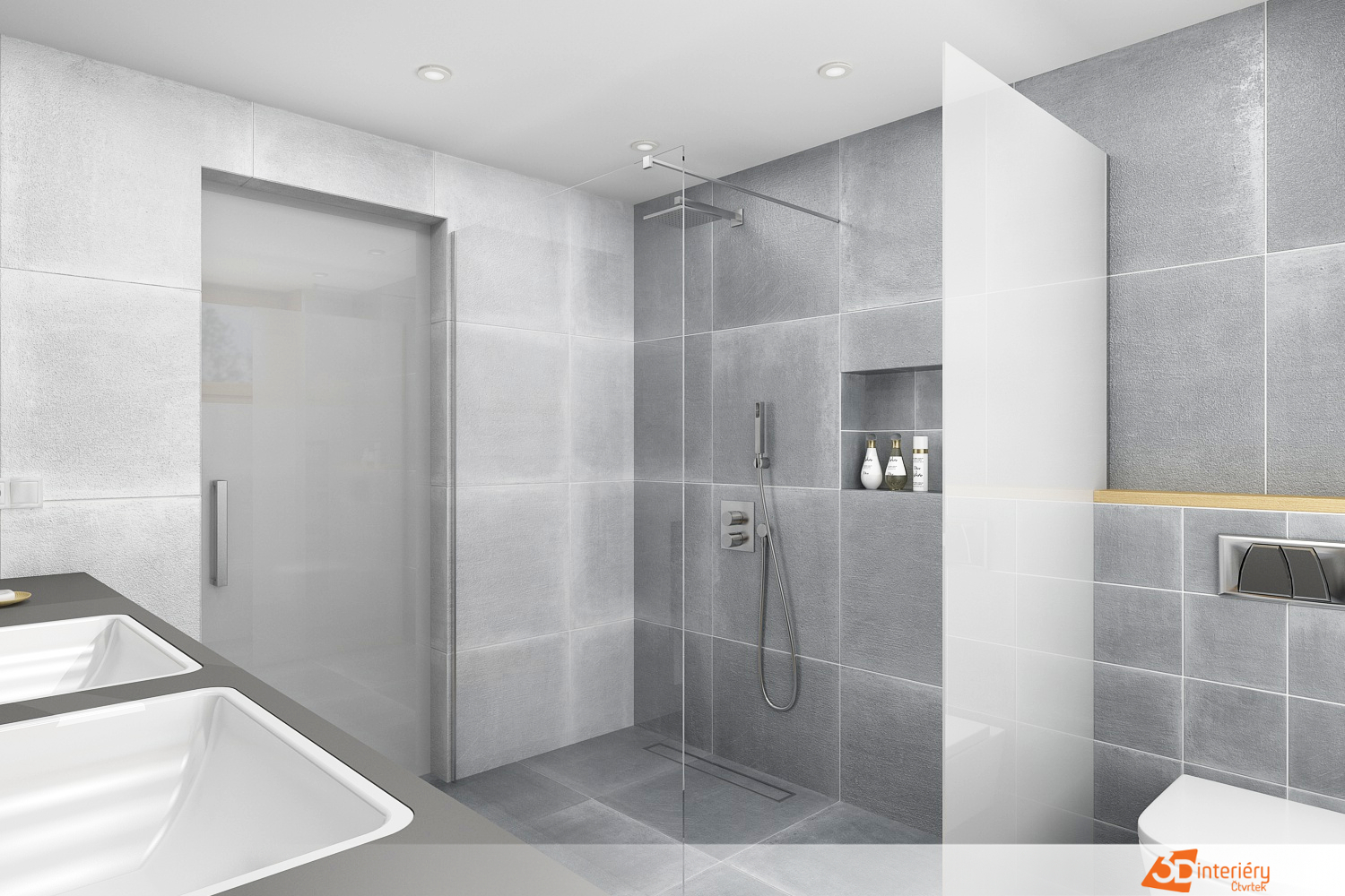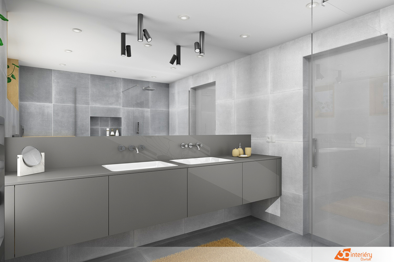 Prostorná koupelna v chladném šedém tónu působí klidně, vyrovnaně a moderně. Dominantní skříňka podél celé stěny nese dvě umyvadla, čímž vzniká komfortní zóna pro dva. Šedá ve více odstínech vytváří jemnou hru materiálů – mat, pololesk i strukturované plochy pracují společně, bez rušivých kontrastů.