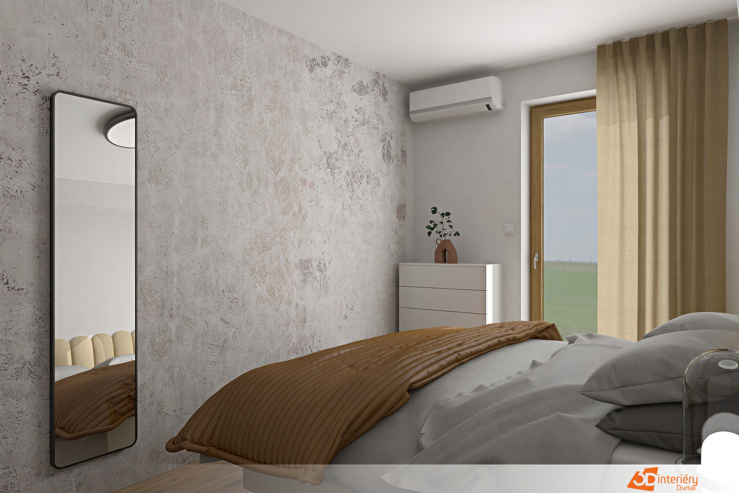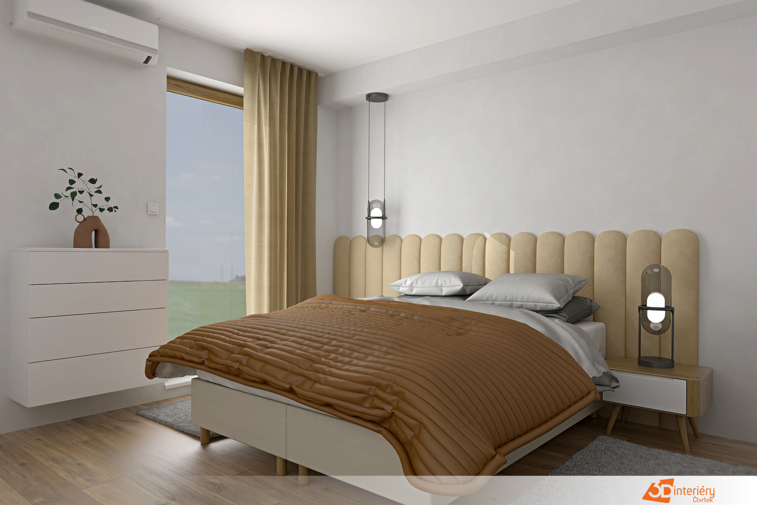 Pokoj působí klidně a elegantně, každý detail vytváří harmonii bez zbytečné okázalosti. Postel dominuje prostoru svým vroubkovaným čelem v krémovém odstínu, který ladí se záclonami stejné barvy. Textilie v tlumených tónech zjemňují světlo a dotvářejí jemnou atmosféru, která podporuje odpočinek.