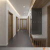 Moderní předsíň s černou podlahou a dřevěnými detaily