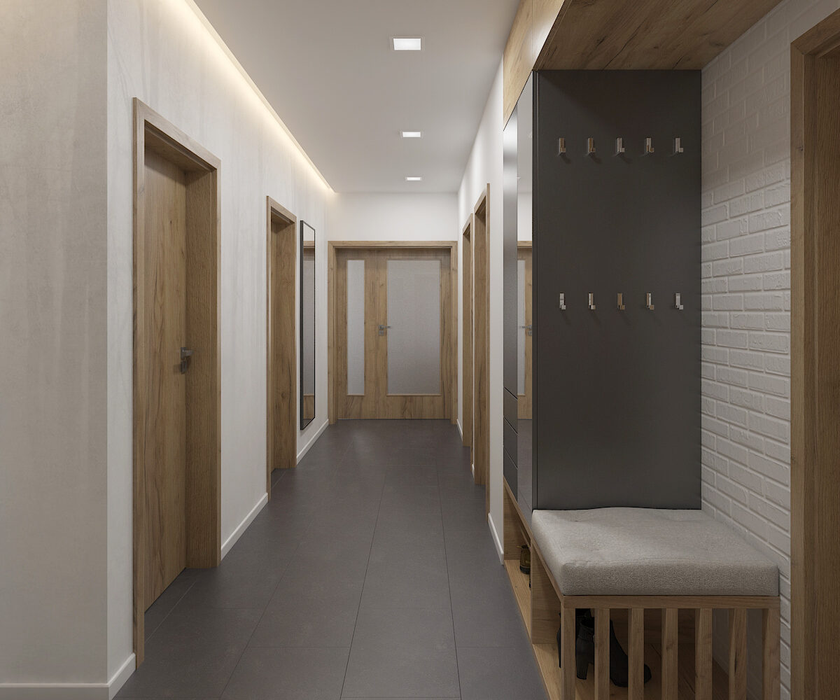 Tato předsíň zaujme nejen funkcí, ale i estetickou čistotou. Každý prvek plní svou roli, přispívá k pohodlí a pořádku při vstupu do domu. Moderní materiály s přírodními akcenty vytvářejí prostředí, které vítá a uklidňuje zároveň.