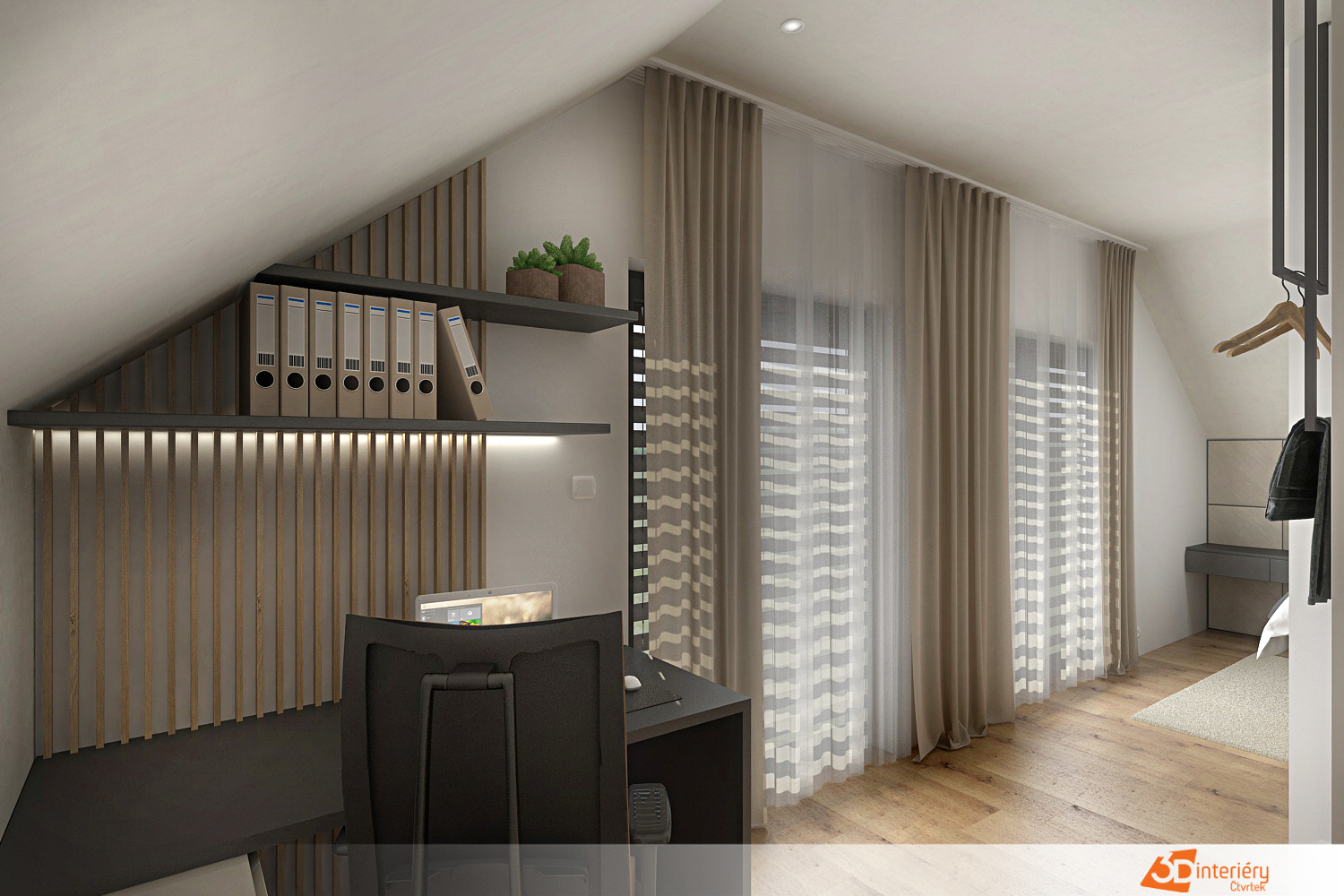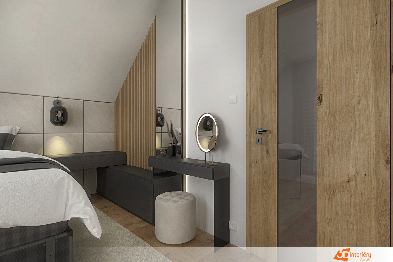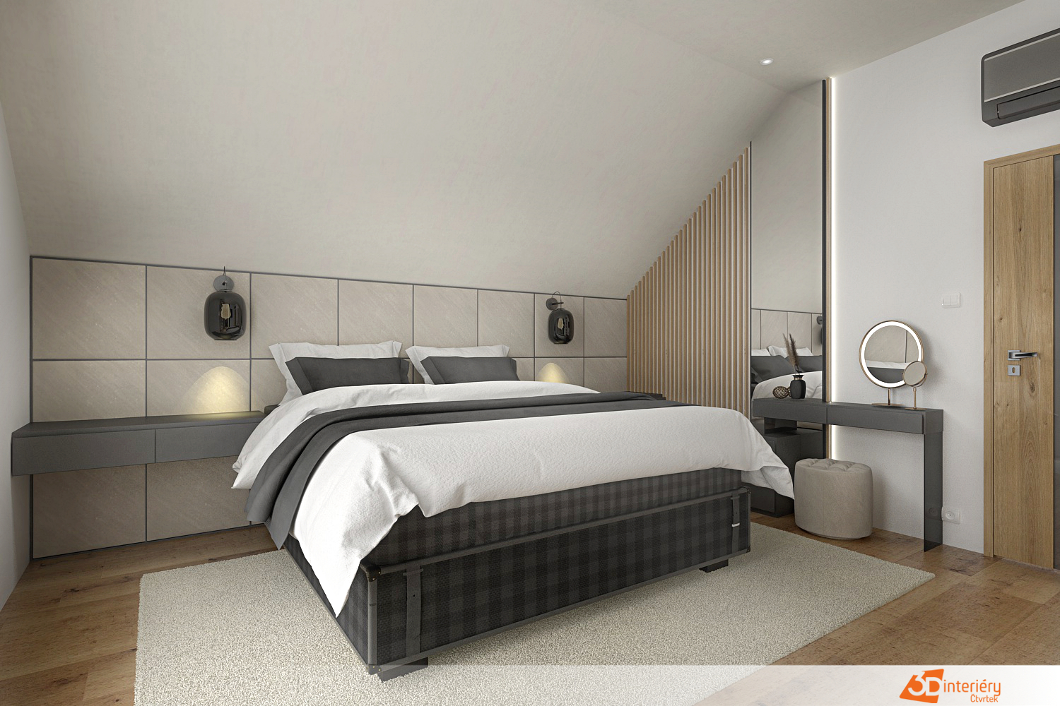 Ložnice nabízí svěží a moderní prostor, kde dominují světlé tóny a jemné akcenty zeleně. Jedinečným designovým prvkem je zelený pruh na zdi, který vnáší do místnosti nádech přírody a oživuje jinak neutrální interiér. Tento zelený detail je přesně vyvážený a působí svěže, aniž by rušil celkovou harmonii pokoje.