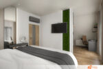 Celý pokoj je světlý a vzdušný, což podtrhuje použití světlých barev a pečlivé uspořádání nábytku. Zelený pruh, černo-bílé lůžko a funkční televize spolu vytvářejí moderní, harmonický a příjemný prostor ideální pro relaxaci.