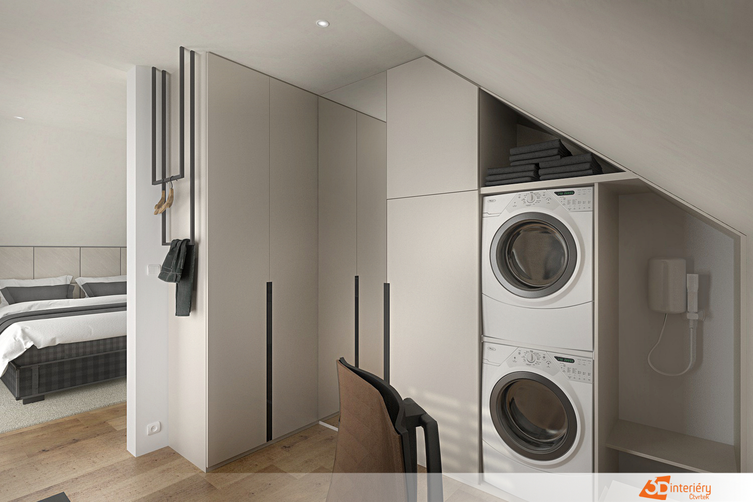 Naprostou praktičnost přináší televize, která je umístěna tak, aby byla dobře viditelná přímo z postele. Díky tomu se prostor stává nejen místem odpočinku, ale i zábavy.
