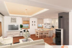 Místnost plynule navazuje na kuchyň a vytváří tak otevřený prostor pro společný čas i každodenní činnosti. Interiér působí svěže a klidně díky převládající bílé barvě, která dominuje jak v části obývací, tak kuchyňské. Bílý gauč stojí v čele prostoru a tvoří přirozené centrum pro odpočinek. Před ním se nachází nízký bílý stoleček, umístěný na černém chlupatém koberečku. Tmavý prvek podtrhuje čistotu světlých ploch a zároveň dodává místnosti potřebný kontrast.
