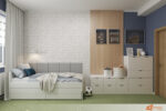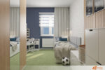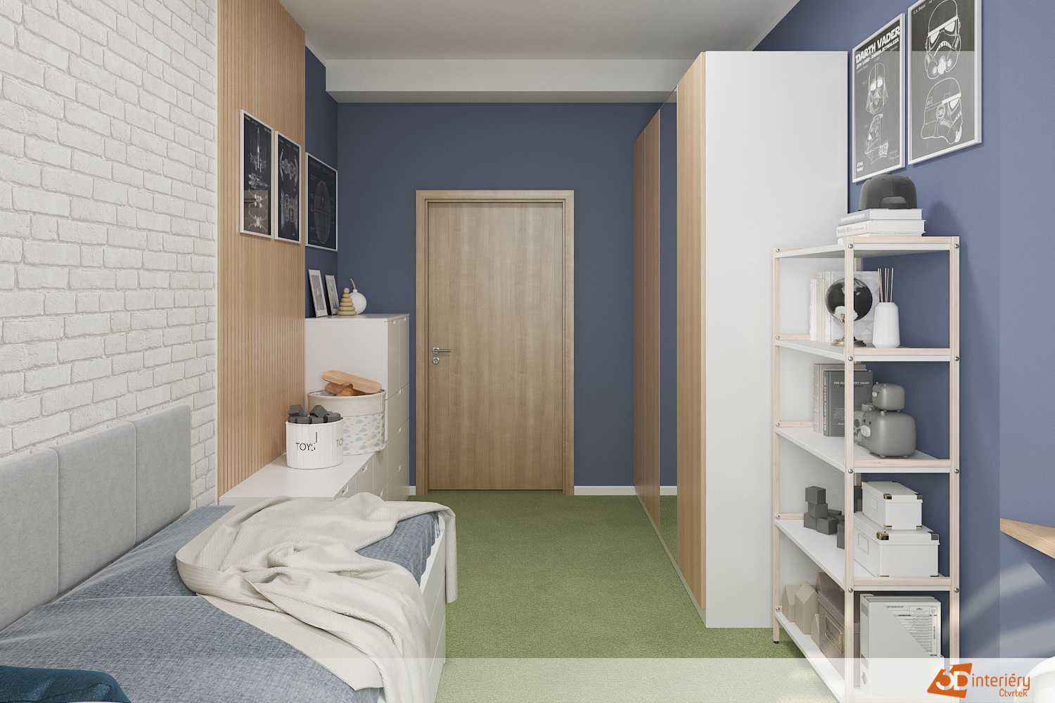 Pokoj tvoří bezpečné a útulné místo pro jednoho kluka. Světle zelené stěny dodávají prostoru svěžest, modré doplňky zajišťují klidnou a vyrovnanou atmosféru. Barvy spolu ladí, nevytvářejí zmatek, ale spíš podporují koncentraci i odpočinek.