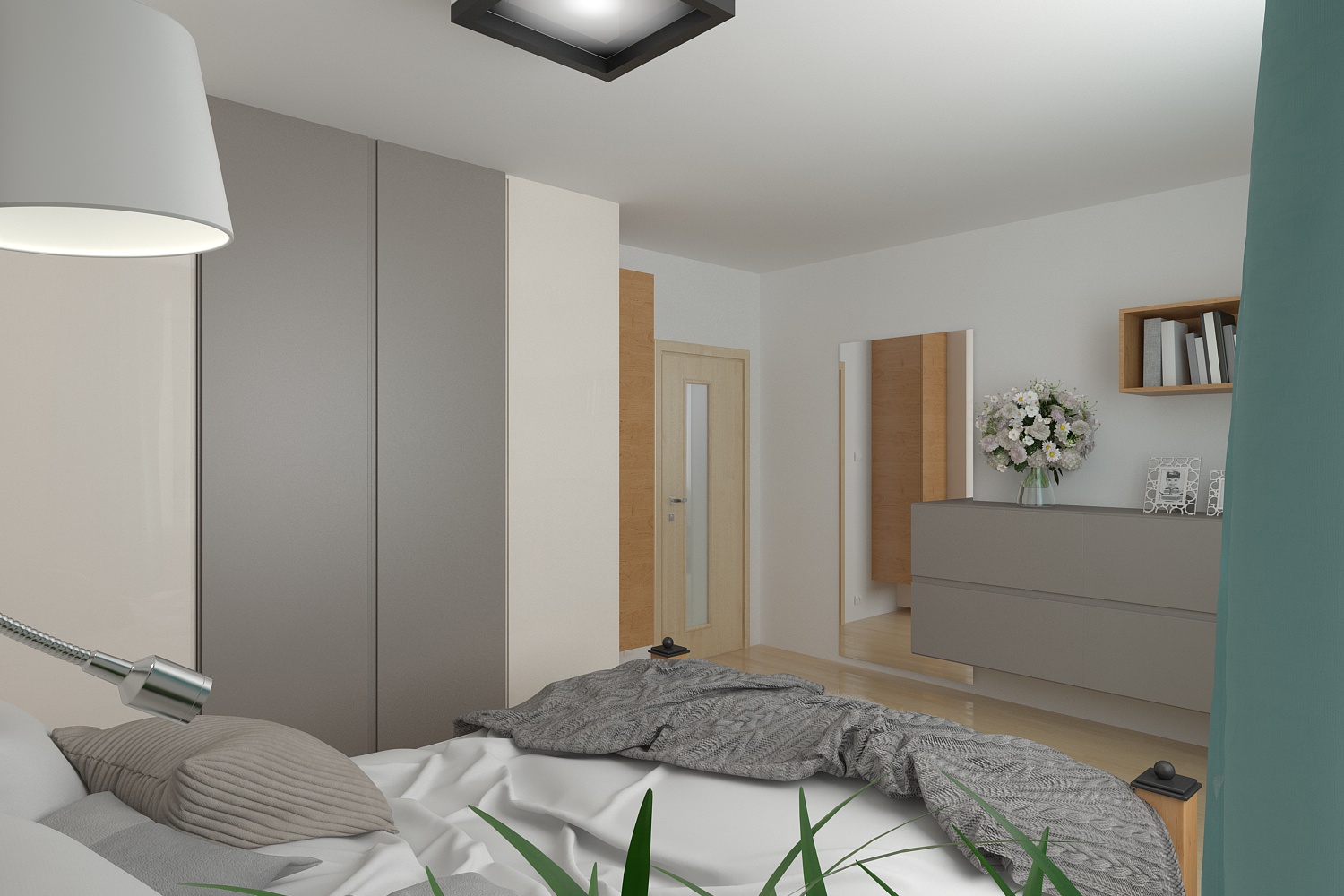 Uprostřed místnosti stojí velké „letiště“ – postel připravená na dlouhé chvíle odpočinku a snění. Nad ní visí galerie obrazů s abstraktními i přírodními motivy, které přinášejí do pokoje kreativní energii a zároveň umělecký nádech. Šedé skříňky s minimalistickým designem doplňují prostor funkčně i esteticky, poskytují dostatek úložného místa a podtrhují moderní styl ložnice.
