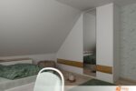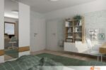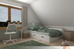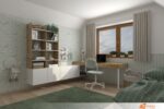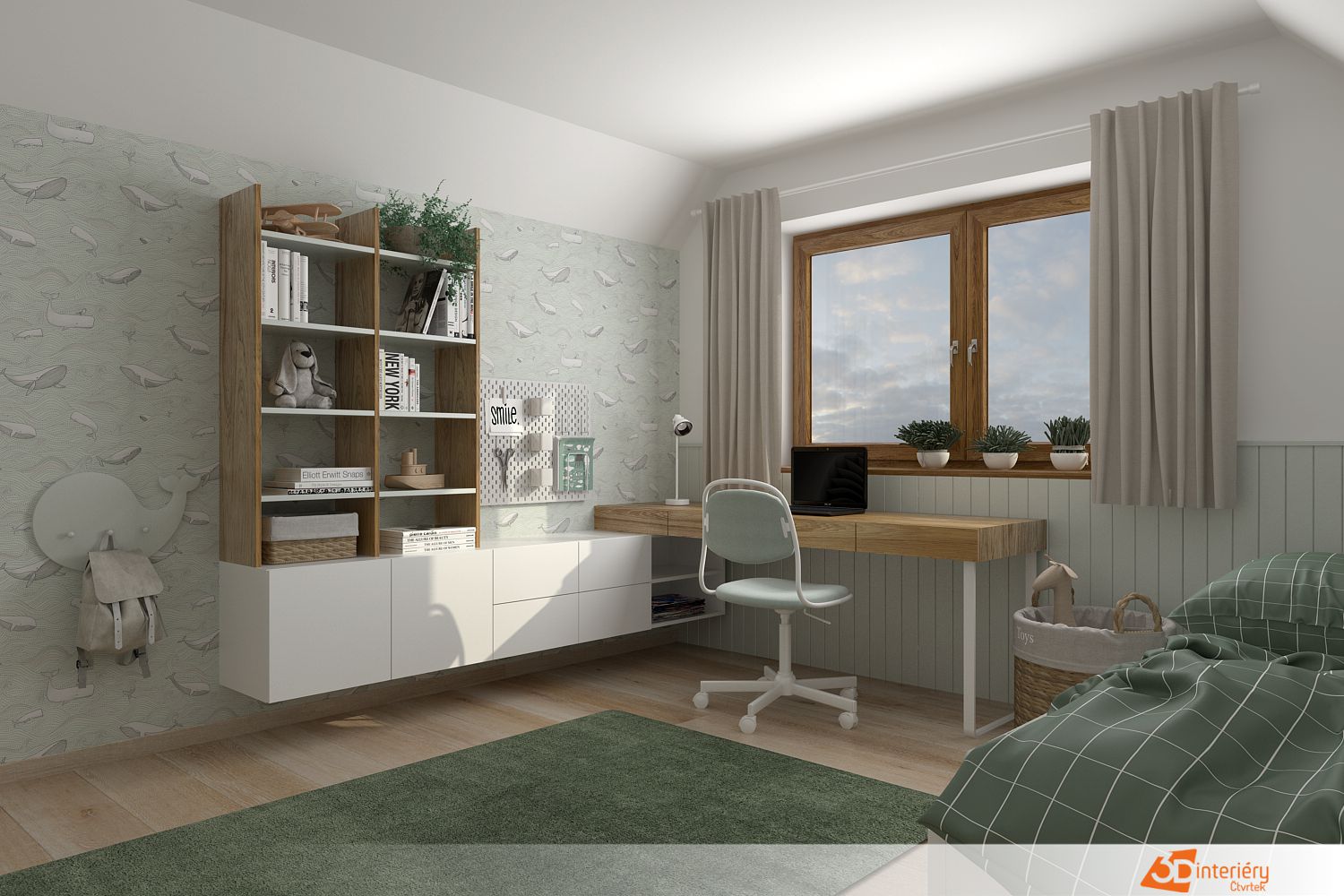Dětský pokoj laděný do odstínů zelené působí klidně, přírodně a osvěžujícím dojmem. Různé tóny od mátové po mechovou vytvářejí harmonii, která podporuje soustředění i hravost. Dřevěné prvky vnášejí do prostoru teplo a útulnost – postel s jednoduchým rámem, police z masivu i pracovní stůl s přírodním povrchem tvoří základ interiéru.
