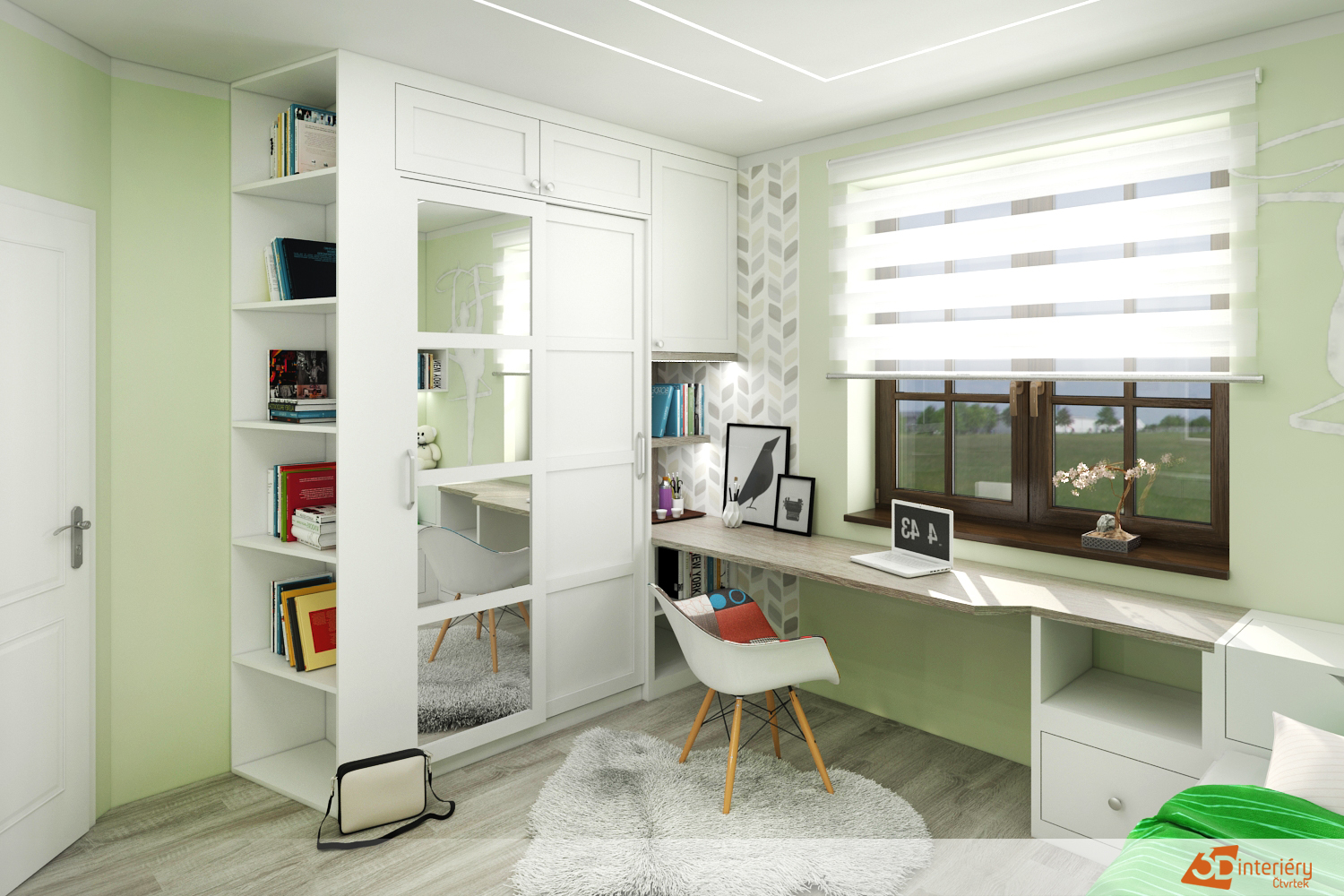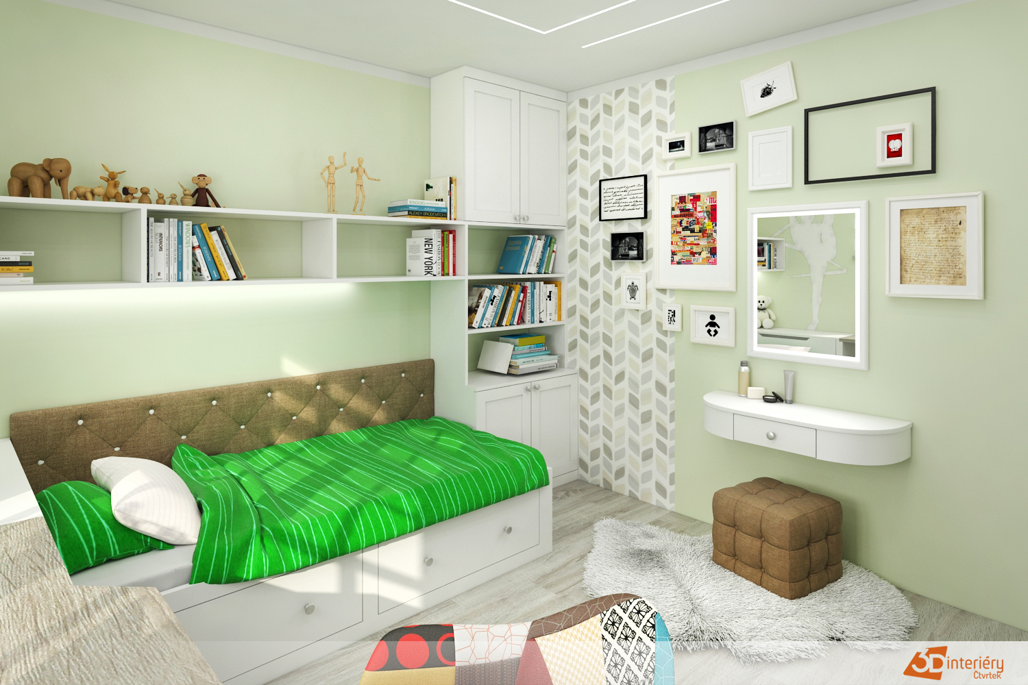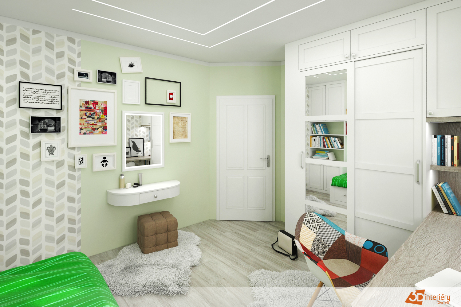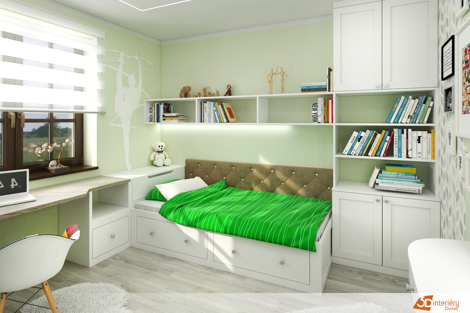 Pokoj působí klidně a svěže. Světle zelené zdi dodávají prostoru příjemnou atmosféru, která připomíná jarní ráno. V levém rohu stojí postel s měkkou matrací a výraznou peřinou v neonově zelené barvě. Tato kombinace barev vytváří živý kontrast, který zaujme na první pohled.