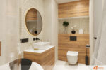 Oáza klidu s nádechem dřeva v koupelně vytváří prostor, kde se tělo i mysl snadno uvolní. Dřevěné prvky na stěnách, podlaze i nábytku přinášejí teplo a harmonii, zatímco přírodní tóny navozují příjemnou atmosféru. Umyvadlo spočívá na masivní desce z dubového dřeva, vedle něj stojí keramické doplňky v jemných barvách. Nad umyvadlem visí zrcadlo v dřevěném rámu, které odráží světlo a opticky zvětšuje prostor.
