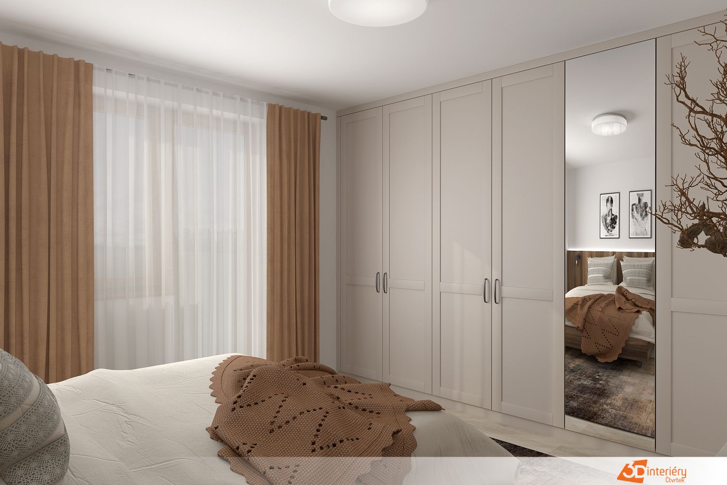 Nad postelí visí dva černobílé obrazy, které stylově doplňují celkový design a přinášejí vizuální rovnováhu. Interiér v krémových a přírodních tónech působí nadčasově, vřele a útulně. Kombinace přírodních materiálů, jemných barev a květinového motivu vytváří prostor, ve kterém se snadno cítíte jako doma.
