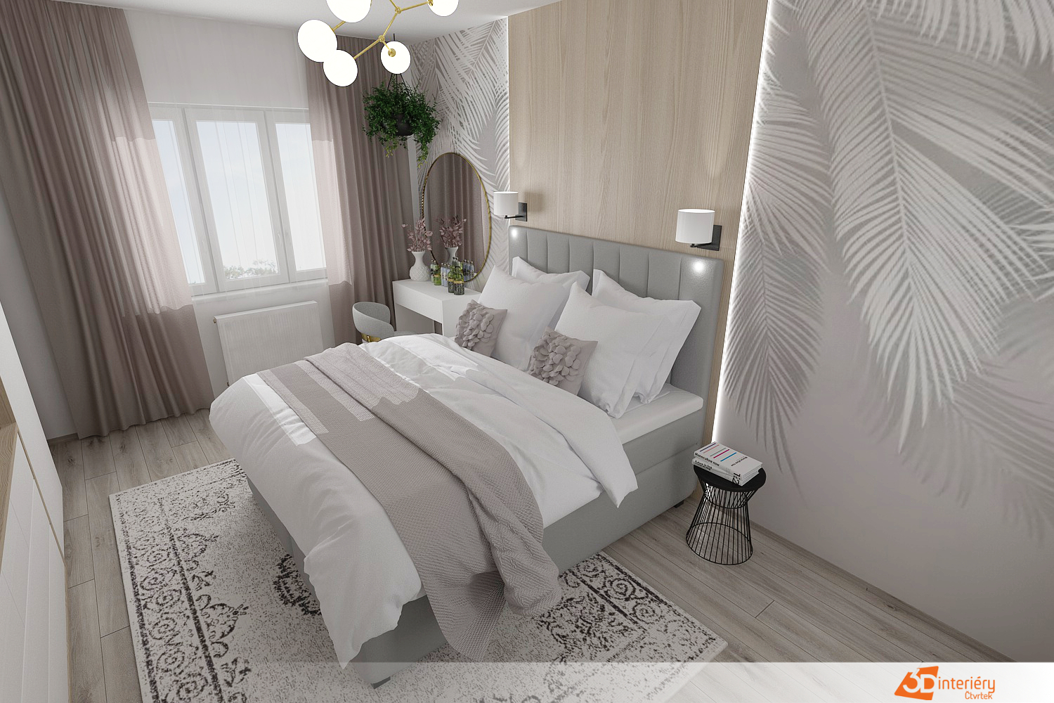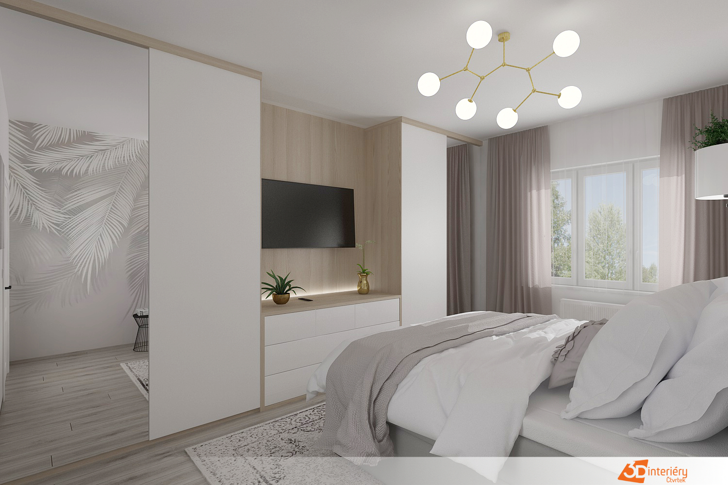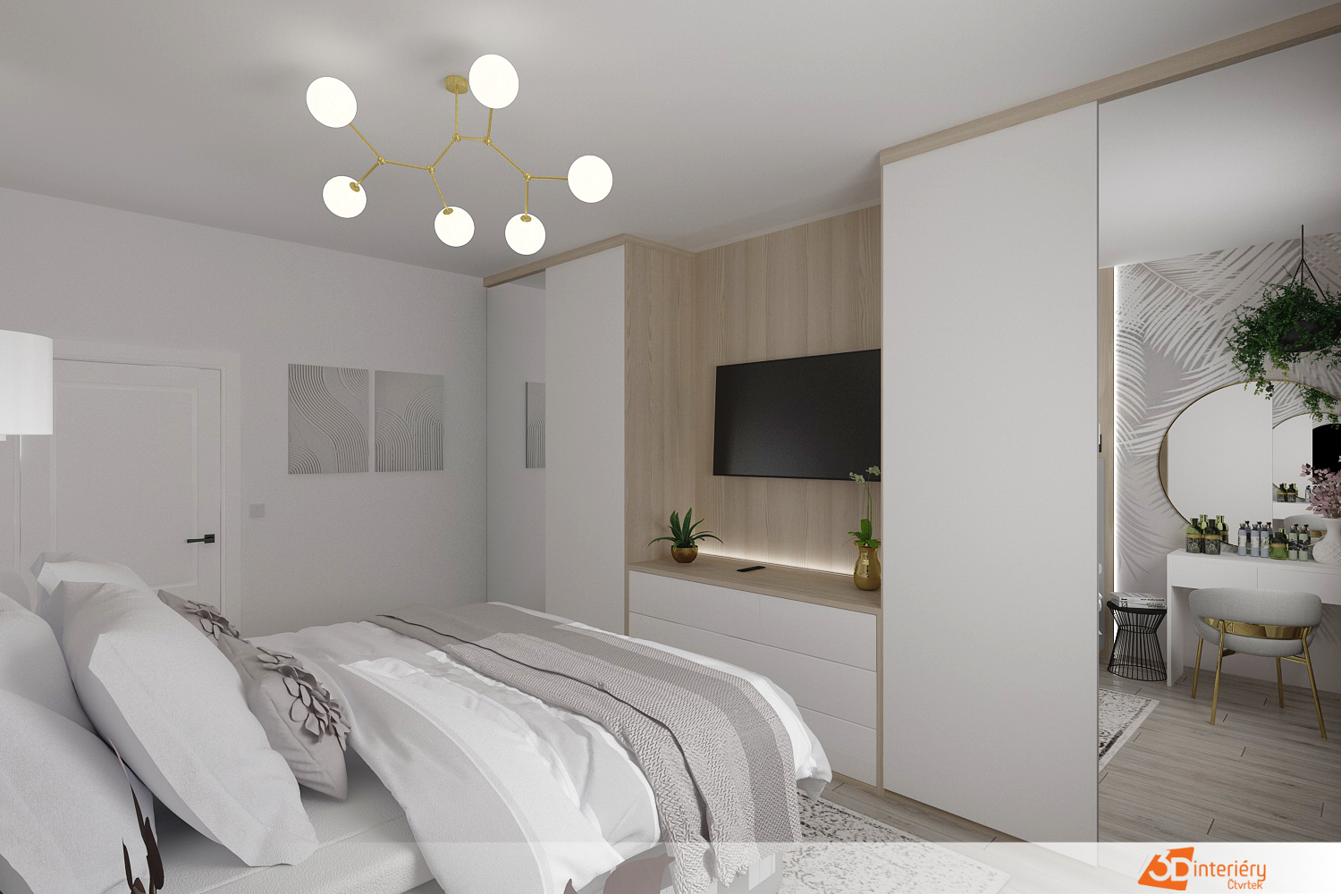 Nově upravená ložnice zaujme svou čistotou a svěžím designem díky dominanci bílé barvy. Stěny, nábytek i doplňky ladí do této neutrální palety, která prostor opticky zvětšuje a dodává mu lehkost. Strop ozvláštňuje zajímavé osvětlení – několik kulatých světel vyčnívajících z jednoho lustru vytváří moderní a hravý prvek, jenž zajišťuje rovnoměrné rozptýlení světla po celé místnosti.