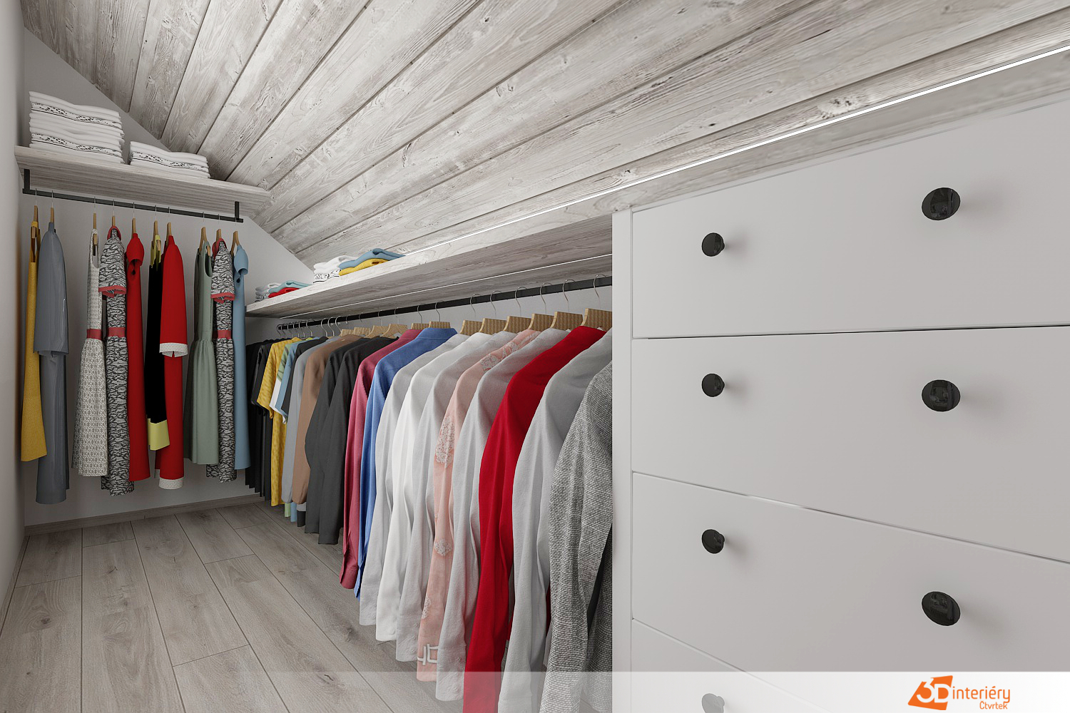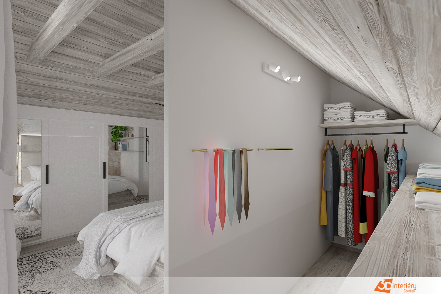 Součástí místnosti se stala praktická šatna, oddělená subtilní zídkou, která dává šatnímu prostoru soukromí a zároveň neubírá vzdušnost celé ložnici. Tento designový prvek přispívá k funkčnosti a zároveň zachovává otevřený pocit prostoru.