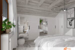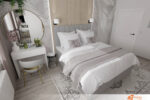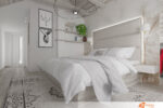 Celkový koncept ložnice klade důraz na jednoduchost a eleganci, kde světlo a prostor hrají hlavní roli. Bílá barva podporuje klidnou atmosféru, ideální pro odpočinek, a zároveň vytváří čisté a harmonické prostředí.
