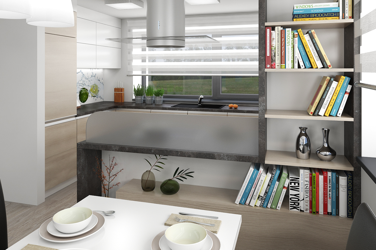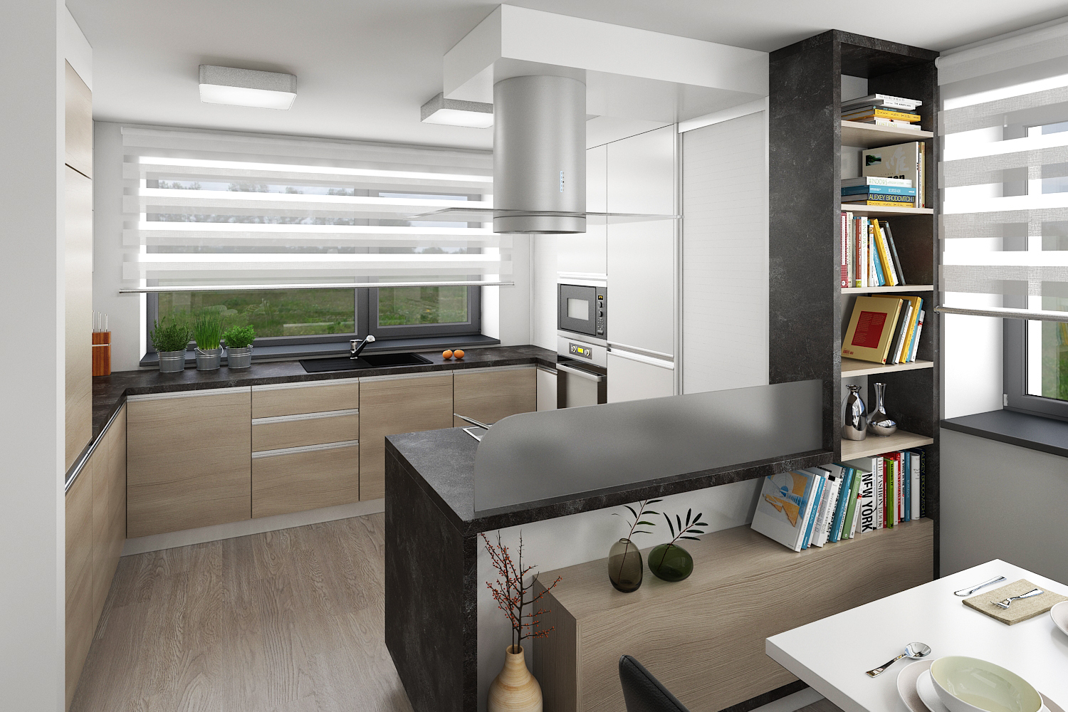 Spojení obýváku a kuchyně podporuje společné chvíle – ať už při vaření, stolování, nebo odpočinku. Jedná se o stylový interiér, který působí moderně, přesto však zůstává příjemný a praktický pro každodenní život.