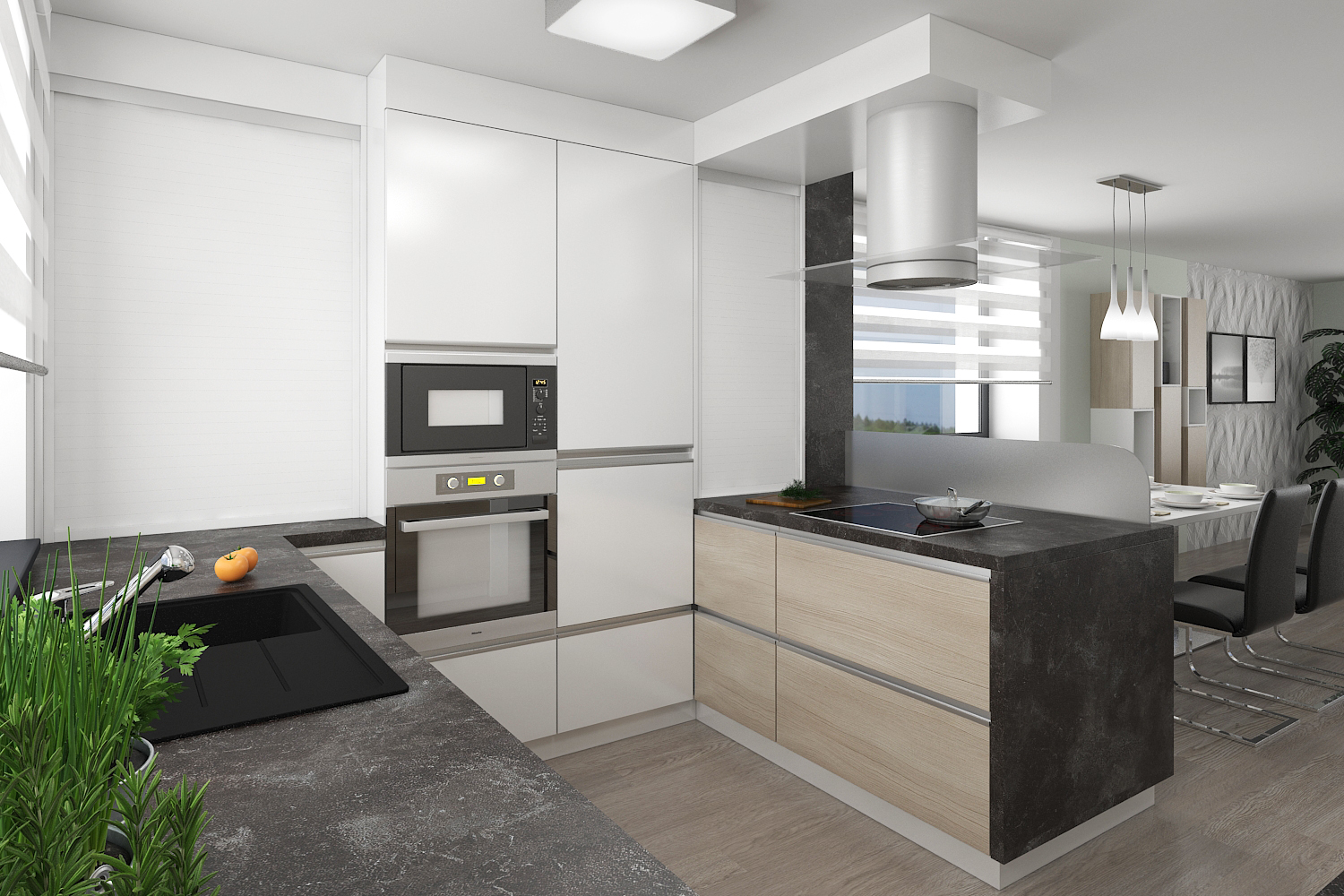 Kuchyňská linka elegantně propojuje obě části místnosti. Horní skříňky jsou černé, čímž korespondují se sedačkou i židlemi, zatímco spodní část zůstává bílá – opět ve shodě s jídelním stolem a stěnami. Tento kontrast působí moderně a zároveň útulně. Celý prostor je promyšlený tak, aby i přes své barevné kontrasty působil jednotně a vyváženě.
