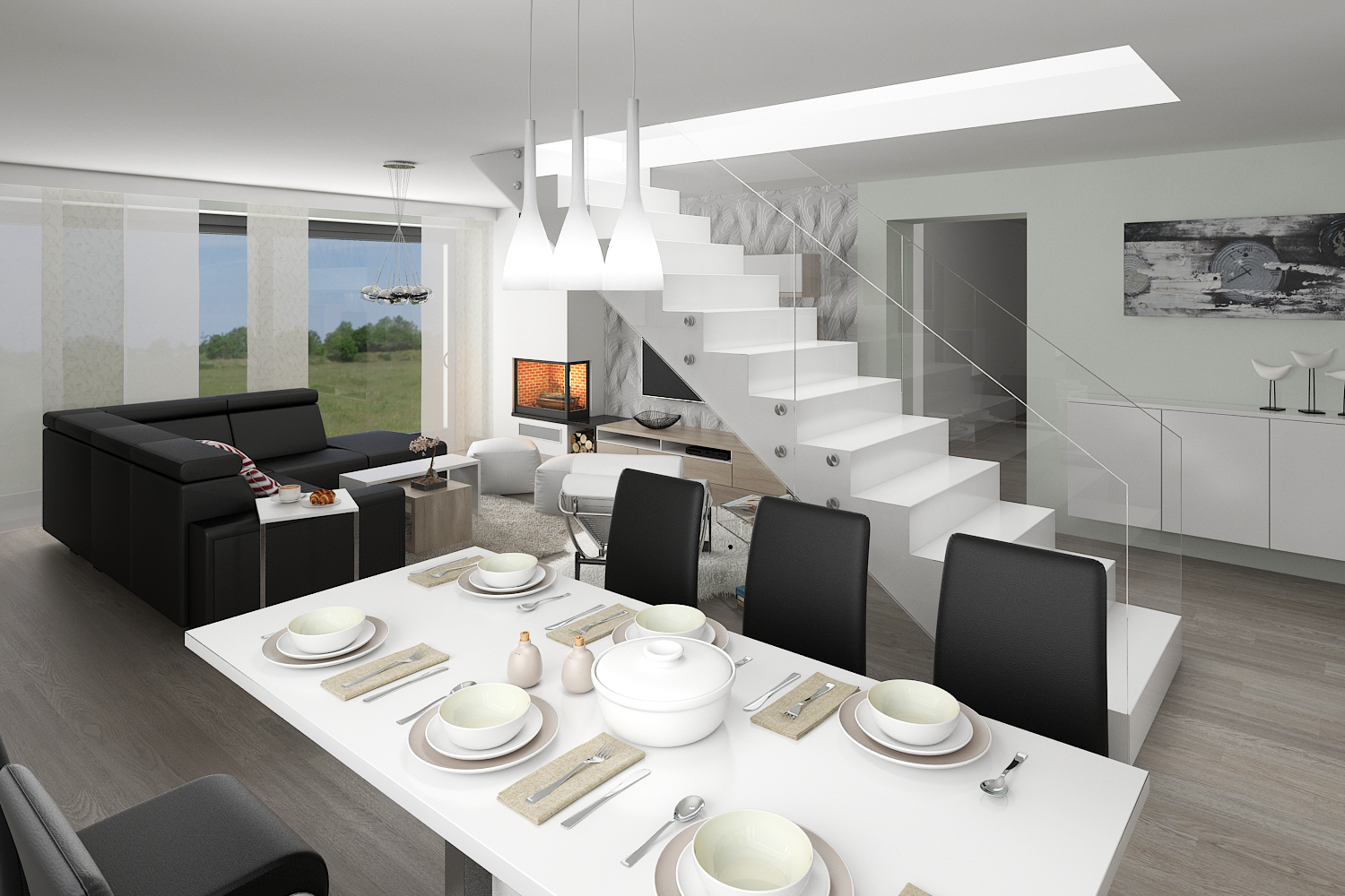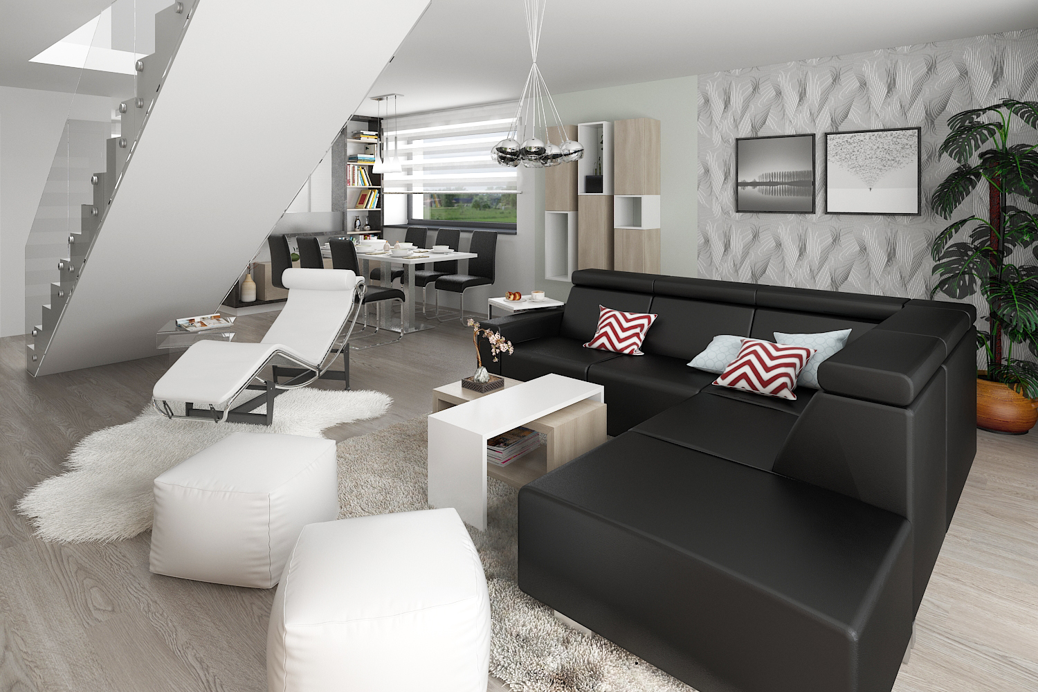 Obývací pokoj propojený s kuchyní tvoří jeden harmonický a moderně laděný prostor, kde se styl snoubí s funkčností. Dominantou obývací části je velký černý rohový gauč, který dodává místnosti výraz a eleganci. Jeho tmavá barva vytváří zajímavý kontrast s bílými stěnami a zároveň krásně ladí s černými koženými židlemi, jež obklopují jídelní stůl. Ten je naopak bílý, což prostor opticky odlehčuje a navazuje na jemný a čistý tón stěn.