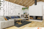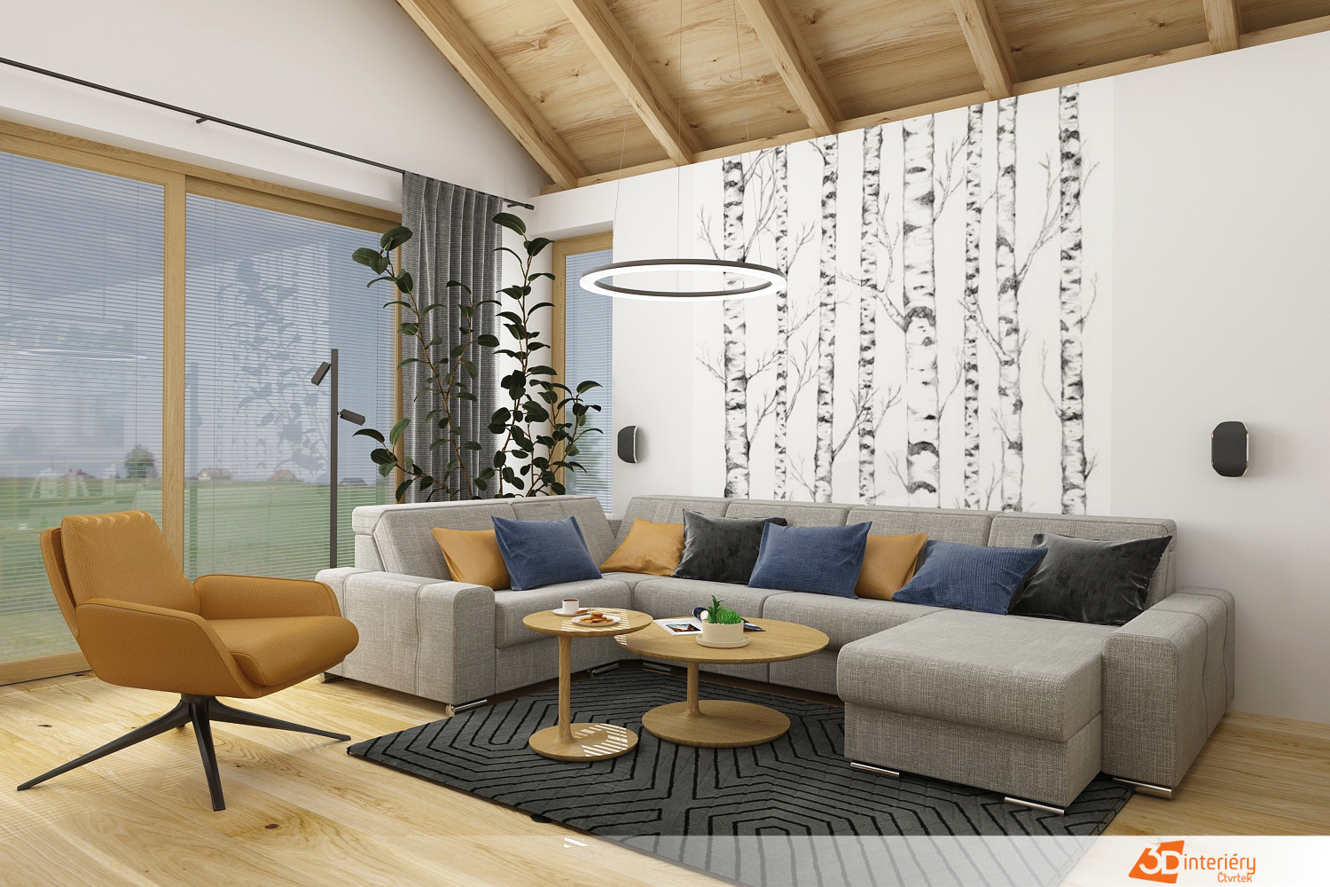 Gauč v šedé barvě nabízí pohodlné místo k odpočinku a zároveň působí jako neutrální prvek, který doplňují barevné polštářky v odstínech modré, žluté a šedé. Tyto doplňky vnucují prostoru živost a zároveň ladí s celkovým přírodním konceptem.
