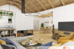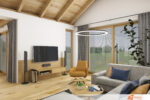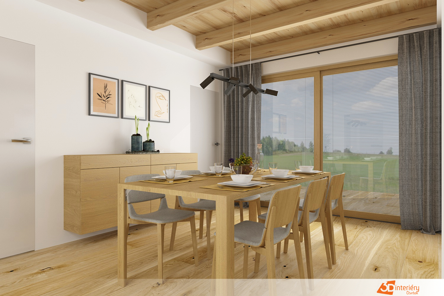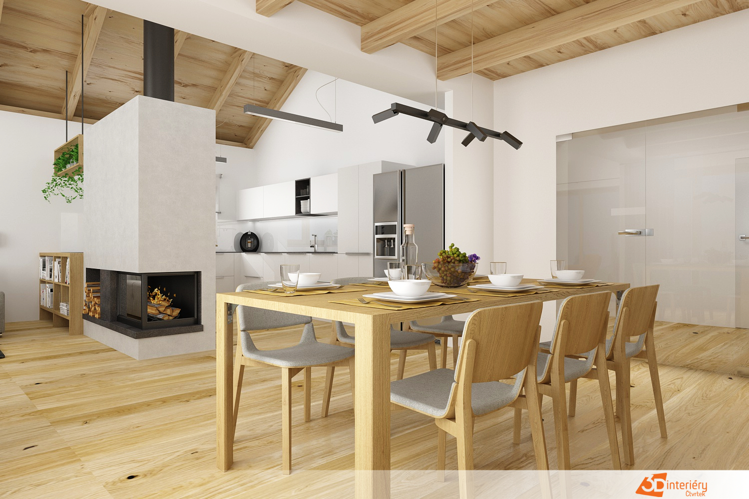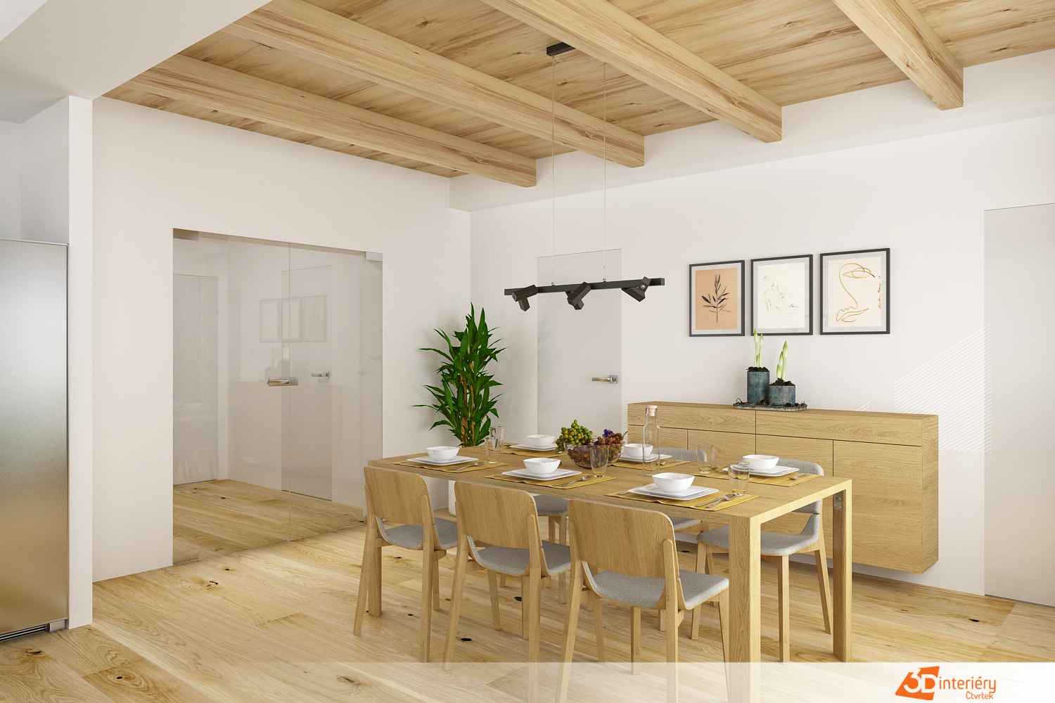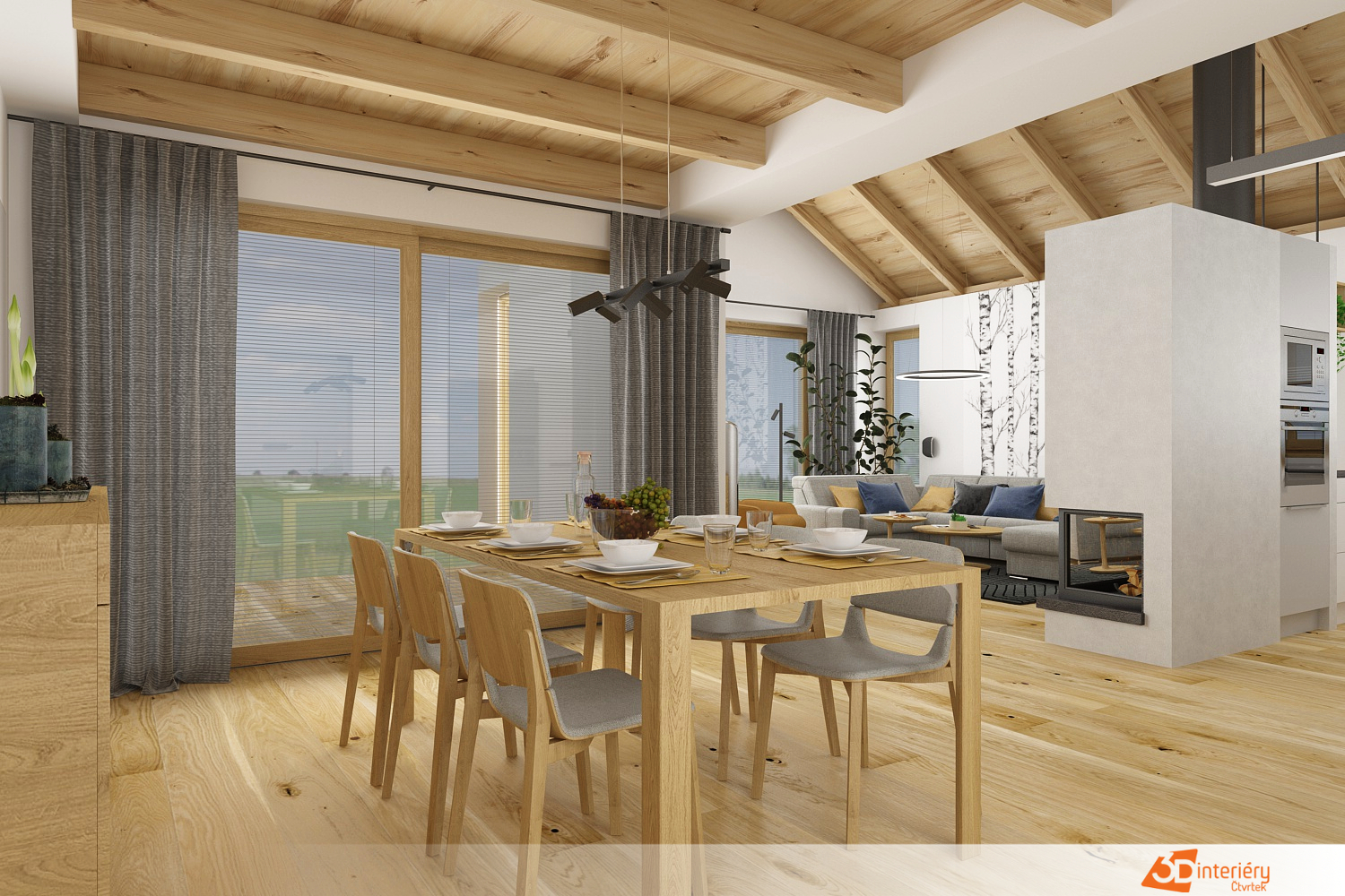 Obývací pokoj s kuchyní tvoří harmonický celek, kde převládá dřevo a světlé barvy. Bílé zdi pomáhají zvýraznit přírodní materiály, které dominují v nábytku i podlaze. Parketová podlaha dodává prostoru teplý, přirozený vzhled a ladí s dřevěným stolem i židlemi v kuchyňské části. Tato kombinace vytváří útulnou a přívětivou atmosféru.