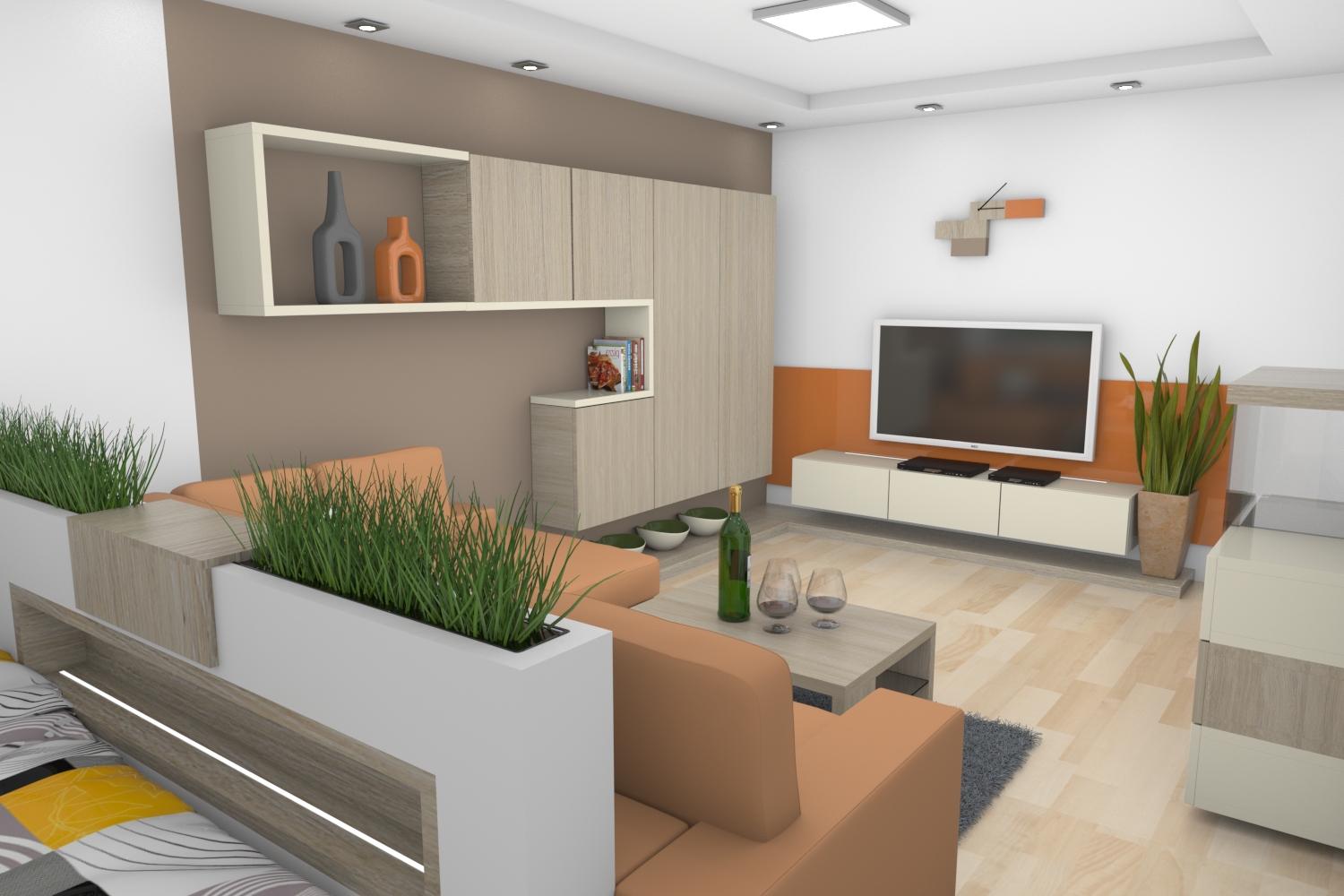 Obývací pokoj působí útulně a přívětivě. Dominantu místnosti tvoří velký hnědý rohový gauč, který přímo vybízí k odpočinku. Jeho měkké polštáře poskytují pohodlí po náročném dni. Rohová část láká k natažení nohou a pohodlnému sledování televize nebo čtení knihy. Před gaučem stojí malý dřevěný stolek, který doplňuje celkový styl pokoje. Na stolku často leží kniha, hrnek s čajem nebo mísa s ovocem. Podlahu pokrývá koberec s jemným vzorem, který spojuje jednotlivé prvky interiéru.