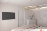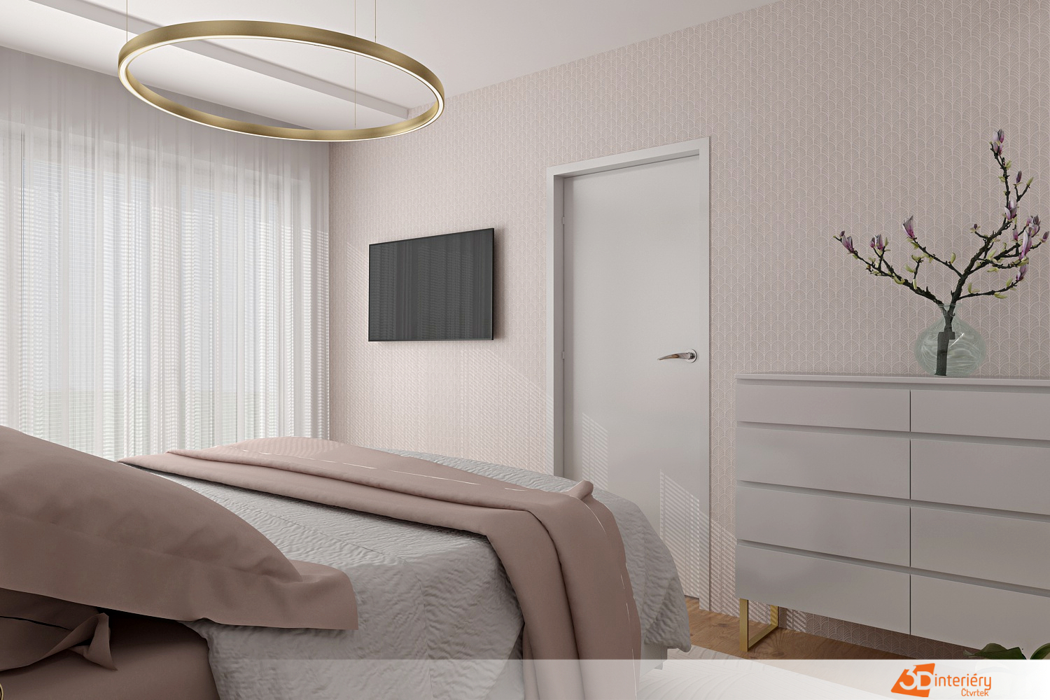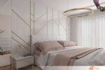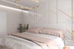 Růžová pastelová ložnice se zlatými liniemi působí jako sen, který se nechce rozplynout. Měkké odstíny růžové pokrývají stěny i strop a vytvářejí dojem, že celý prostor dýchá klidem. Světlo z okna padá na záclony z jemného tylu a kreslí na podlahu vzory, které se mění podle denní doby.