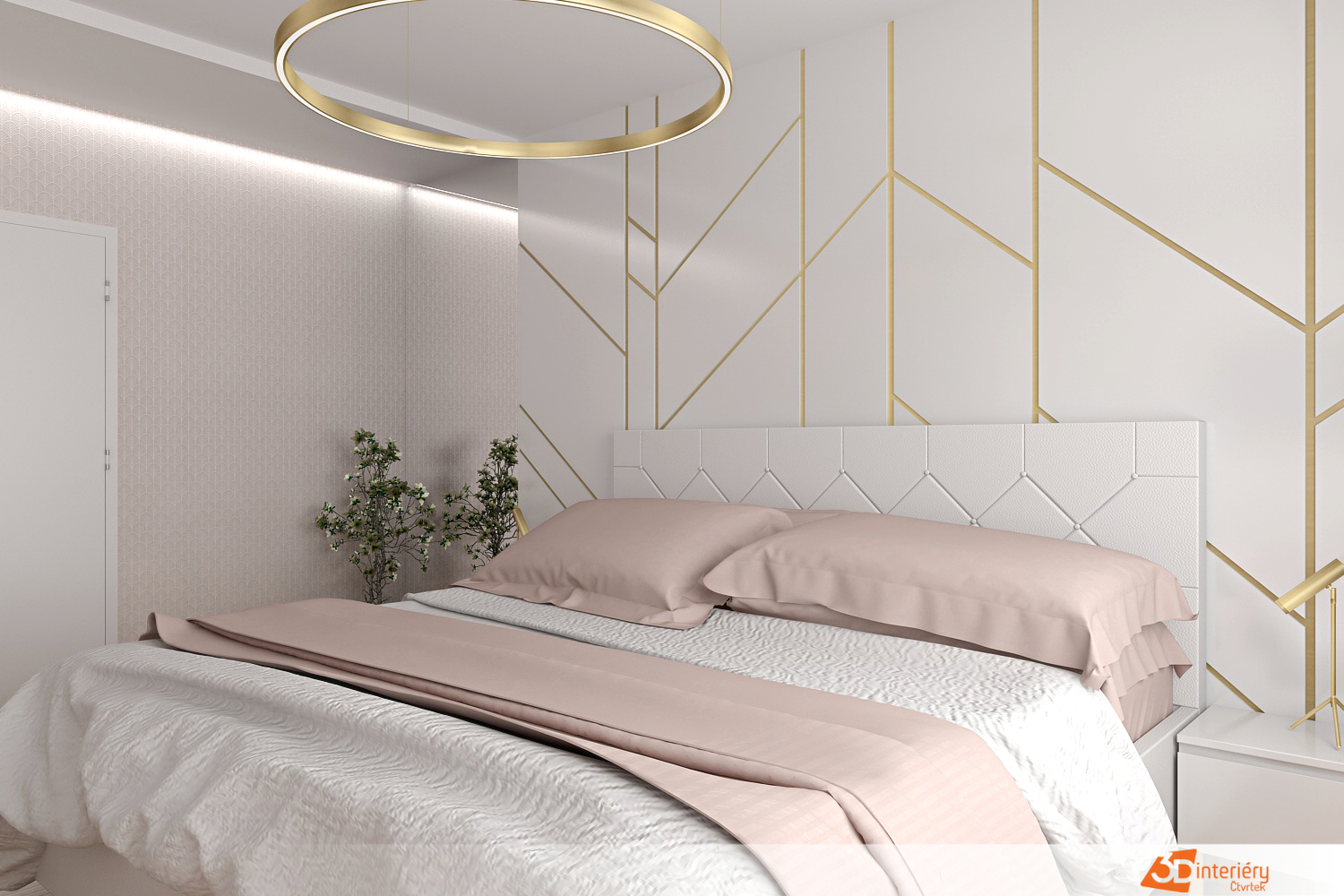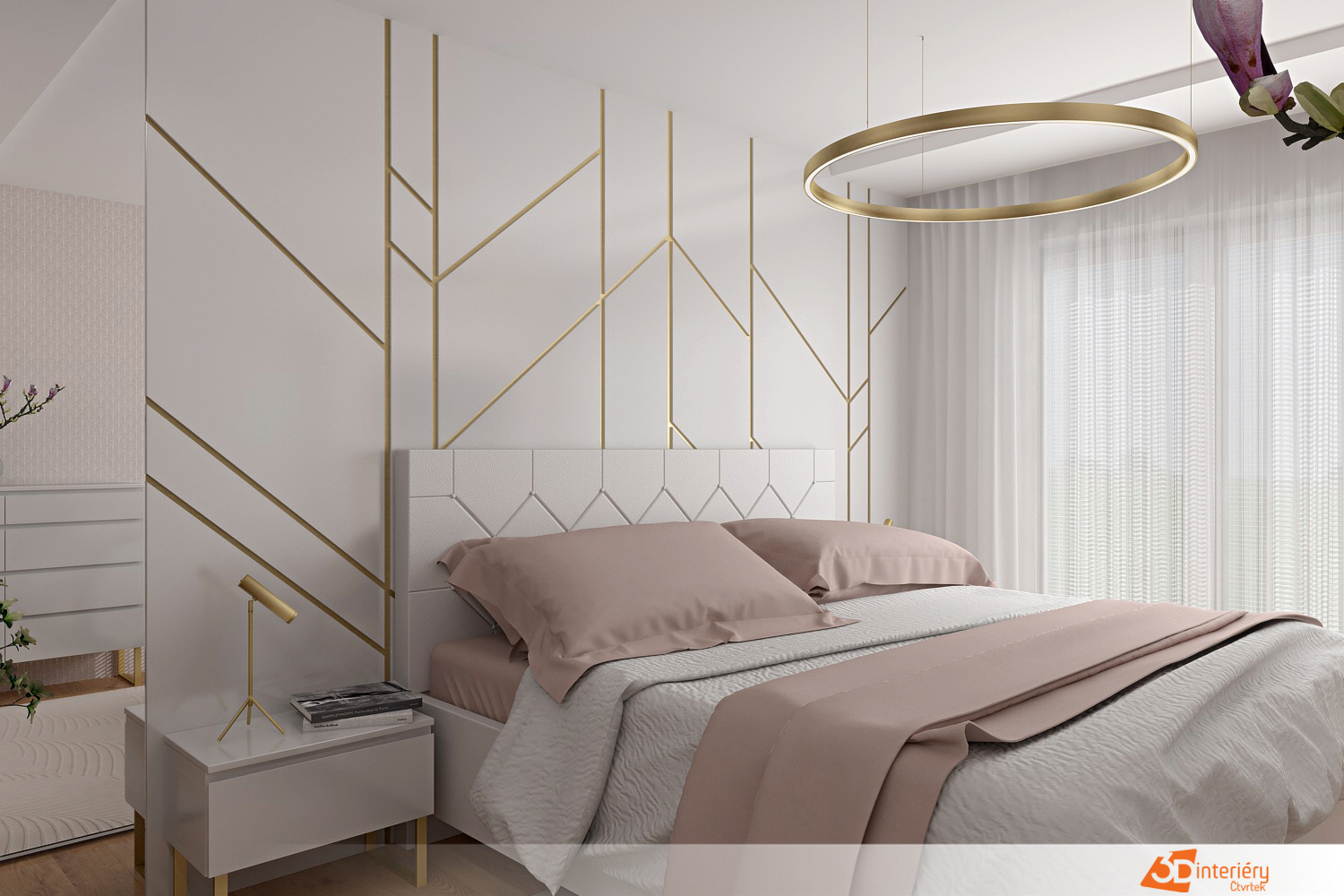 Zlaté linie vedou pohled po hranách zrcadel, obrazových rámů i tenkých nohou nábytku. Každý detail ladí s okolím, nic neruší – vše spolu hraje tichou harmonii. Postel s oblým čelem a měkkým přehozem připomíná oblak, do kterého se dá bez váhání ponořit.