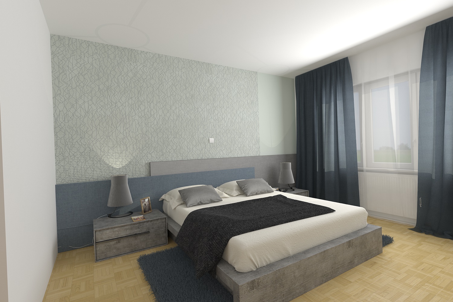 Zeď za postelí nese velmi světlý odstín modré, který navozuje dojem svěžesti a čistoty. Tato barva kontrastuje s tmavšími závěsy a zároveň ladí s ostatními prvky v místnosti. Po obou stranách postele stojí šedé noční stolky se stejnými šedými lampičkami, jejichž jednoduchý design zapadá do celkového stylu ložnice.