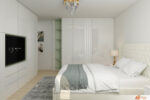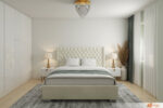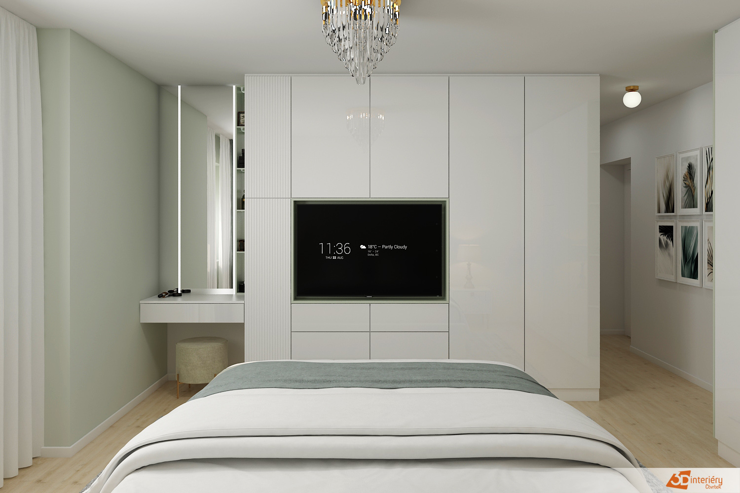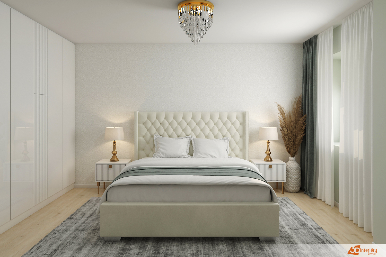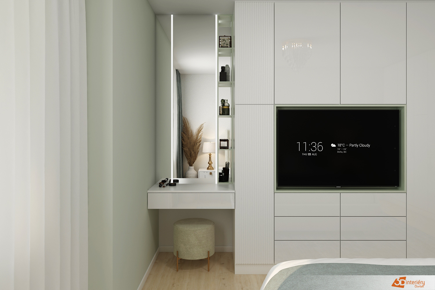 Každý kus nábytku působí lehce – židle s oblými liniemi, stůl se skleněnou deskou a postel s peřinou, která evokuje sníh čerstvě napadaný na louce. Na parapetu spočívá hrnek s čajem, z nějž stoupá pára, která kreslí prchavé obrazy do vzduchu. V rohu tiše hoří svíčka s vůní bílého čaje a jasmínu.