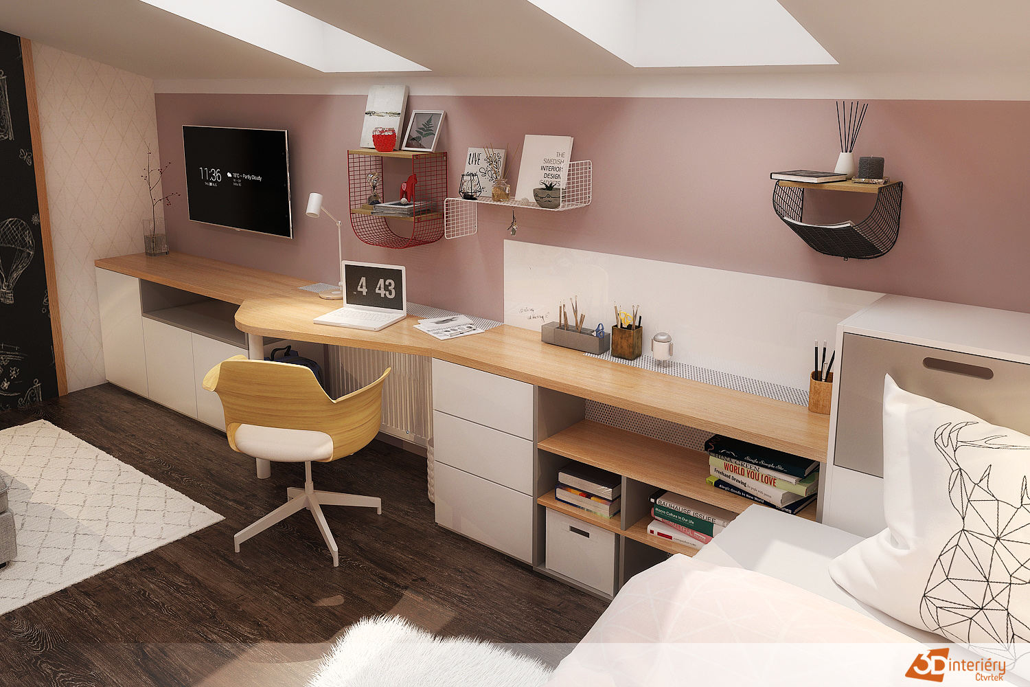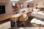Pokoj ideální pro dospívající slečny nabízí prostor plný inspirace, klidu i možností pro sebevyjádření. Světlé stěny doplňují barevné doplňky, které odrážejí osobnost a nálady. Postel s měkkými polštáři a přikrývkami vytváří útulné místo pro odpočinek po náročném dni. U okna stojí psací stůl s organizéry na školní potřeby, knihy i kreativní pomůcky, který podporuje soustředění i tvořivost.