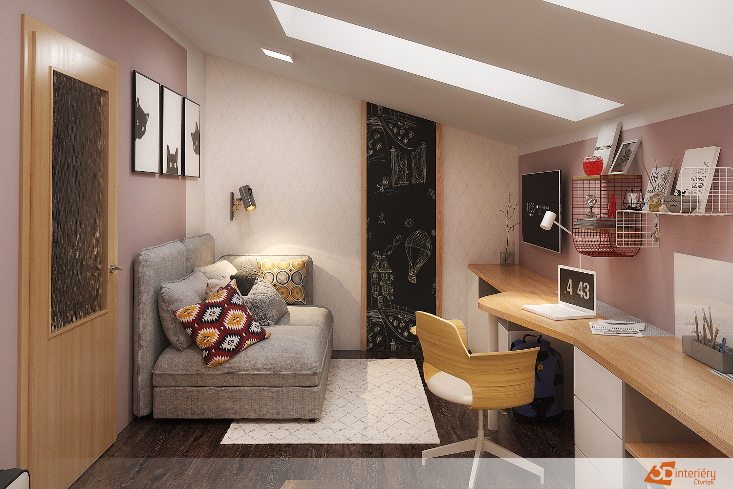 V rohu pokoje vzniká malý relaxační koutek s pohodlným křeslem a lampou, kam přijde potřeba úniku od každodenního shonu. Na stěnách visí obrázky, fotografie přátel, plakáty oblíbených kapel i motivační citáty, které dodávají sílu a sebevědomí. Úložné prostory v podobě skříní, polic i boxů udržují pořádek, což usnadňuje soustředění.