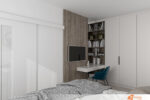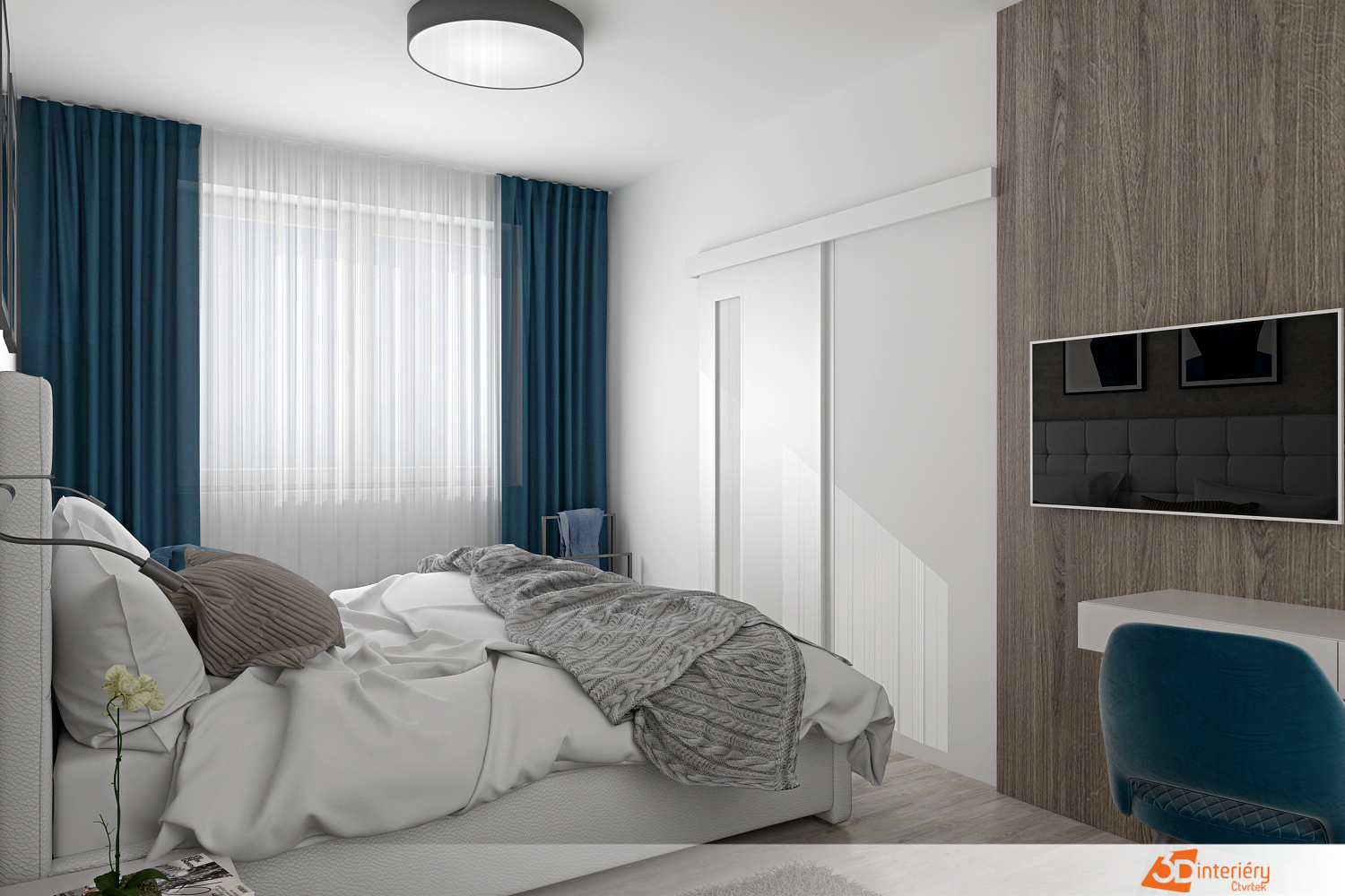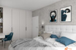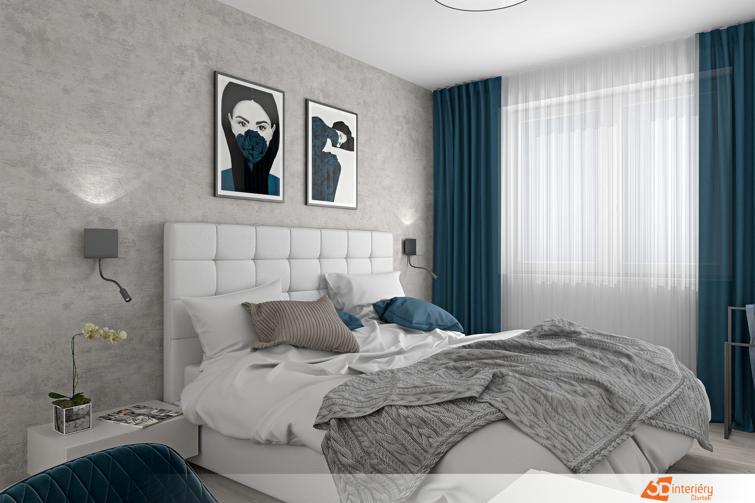 Středem místnosti je velká bílá postel s čalouněným čelem, které působí měkce a pohodlně. Její čistý design a světlá barva dodávají místnosti lehkost a vzdušnost. Nad postelí visí několik obrazů, které barevně ladí s modrými závěsy, čímž prostor sjednocují a dodávají mu osobitý charakter.