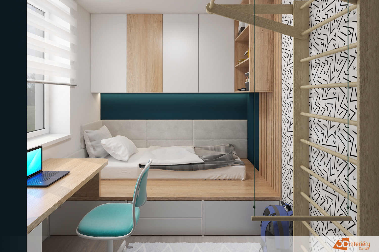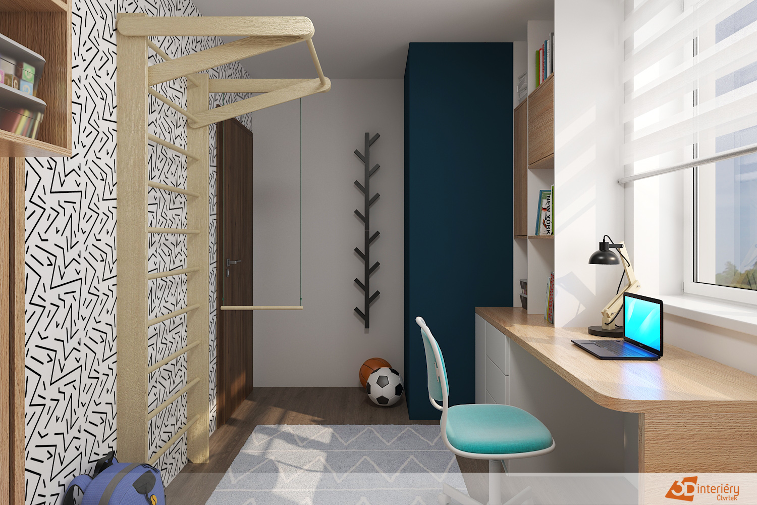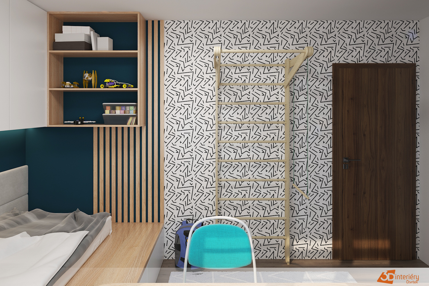 Pokoj s žebřinami na stěně zaujme sportovním duchem i moderním vzhledem. Žebřiny z masivního dřeva tvoří dominantu celé stěny a nabízejí prostor pro pohyb, protahování nebo jednoduché cviky. Děti i dospělí si díky nim udržují aktivní denní režim přímo v pokoji. Stěna za žebřinami nese stylovou tapetu s geometrickým vzorem, která místnosti dodává energii a současný vzhled.